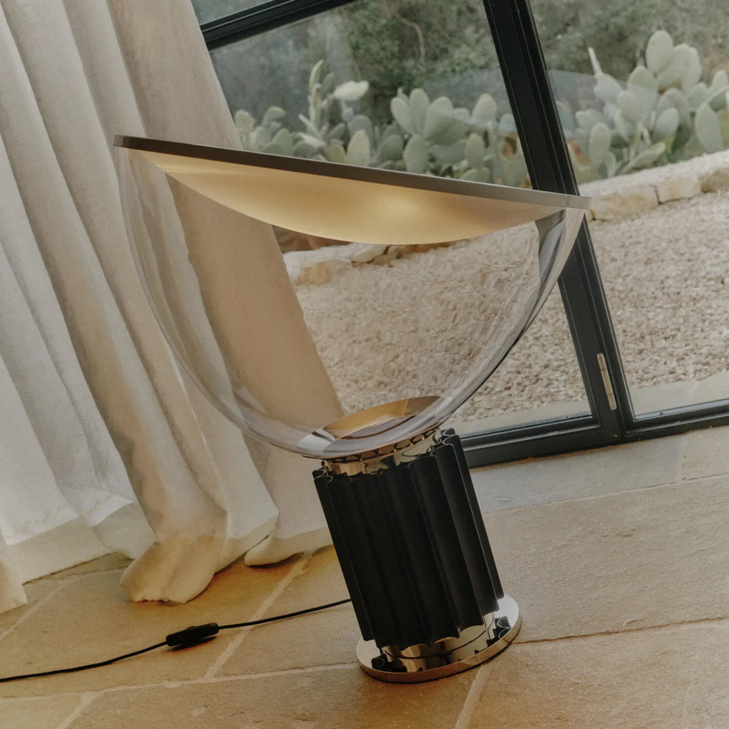 Bordlampe med indirekte og reflekteret lys. Reflektor i lakeret aluminium, blank hvid på ydersiden og mat hvid på indersiden. Retningsbestemt skærm i transparent, mundblæst glas. Armaturhus i sort, mat hvid, sølvanodiseret eller bronzeanodiseret aluminium. Base i forniklet metal. Elektrisk kabel med en brugbar længde på 220 cm, med lysdæmperkontakt til ON/OFF og justering af lysstrømmen mellem 10-100%. Plug-in-strømforsyning med udskiftelige stik.