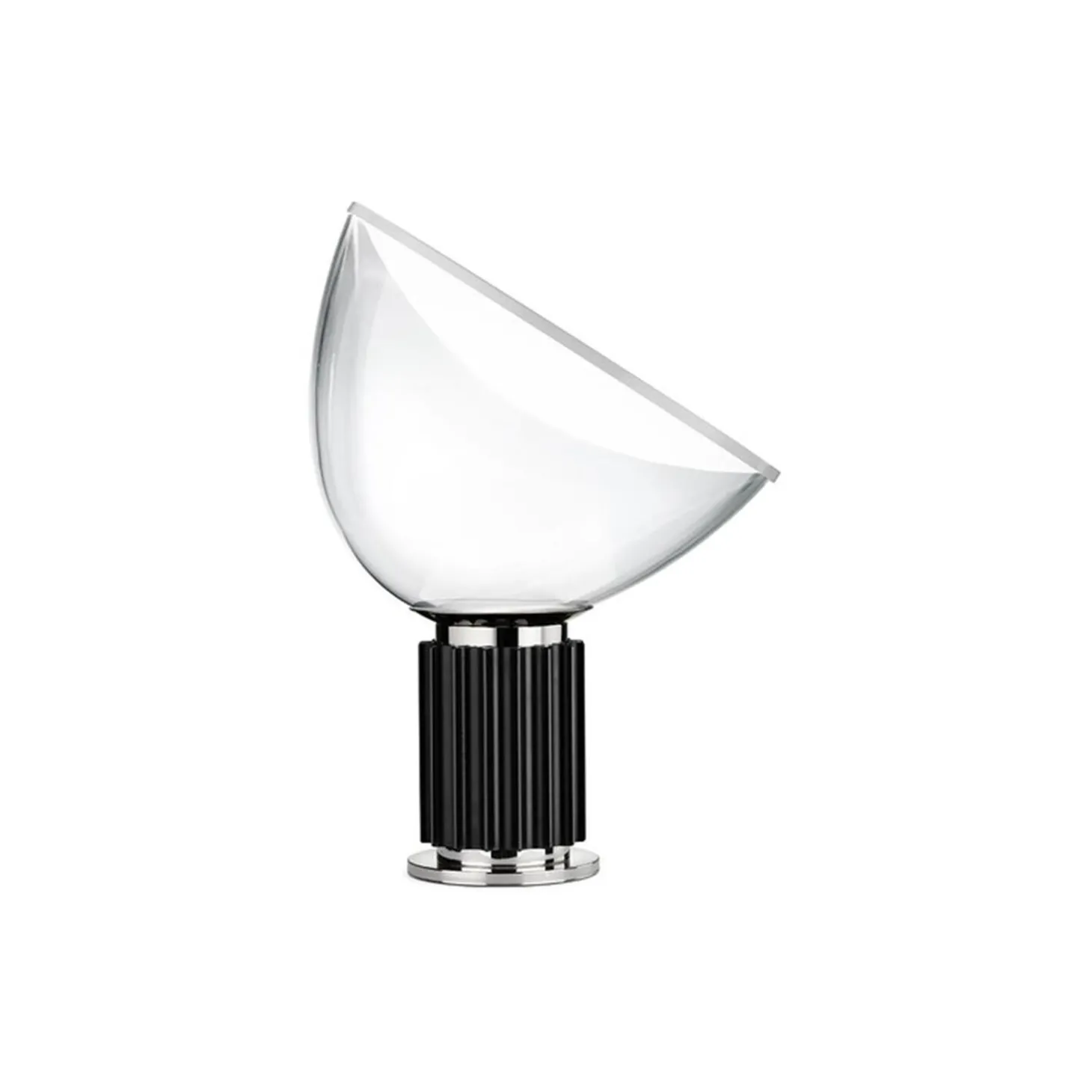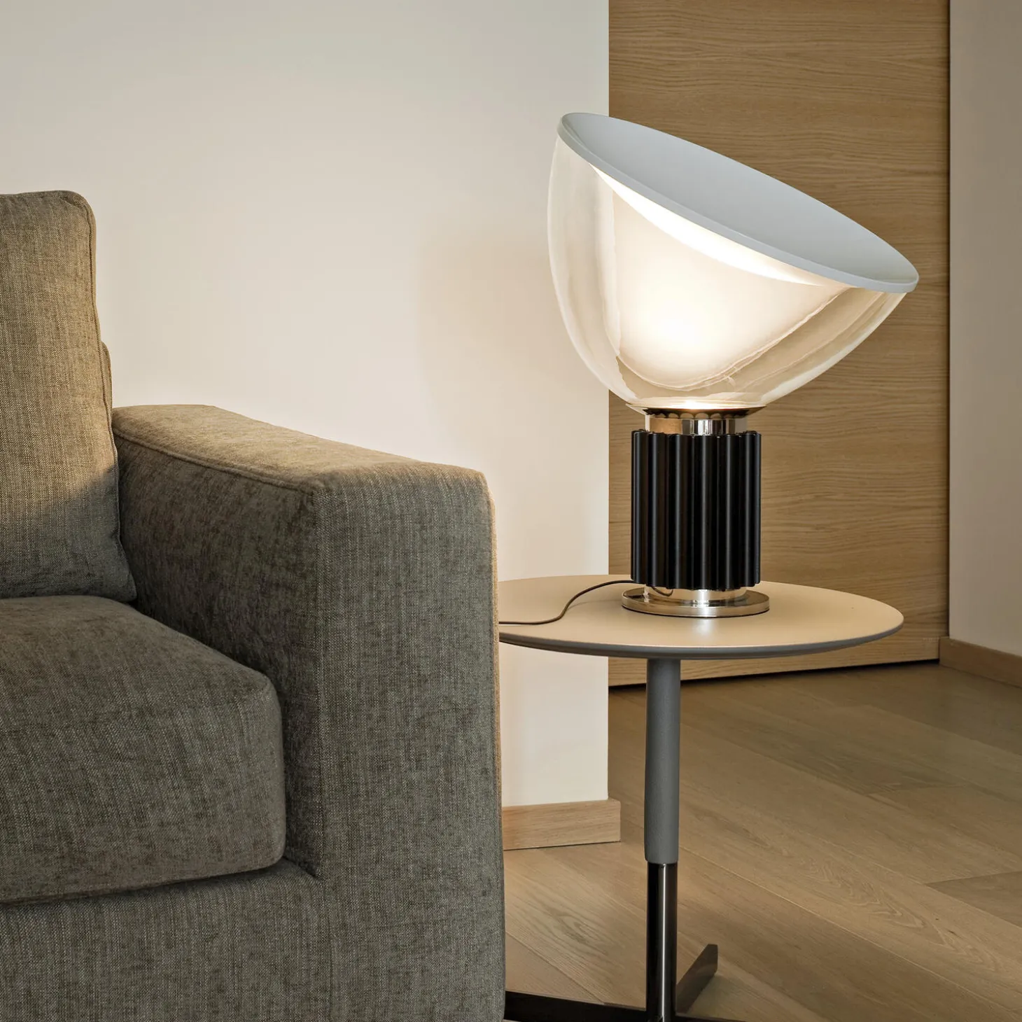 Bordlampe med indirekte og reflekteret lys. Reflektor i lakeret aluminium, blank hvid på ydersiden og mat hvid på indersiden. Retningsbestemt skærm i transparent, mundblæst glas. Armaturhus i sort, mat hvid, sølvanodiseret eller bronzeanodiseret aluminium. Base i forniklet metal. Elektrisk kabel med en brugbar længde på 220 cm, med lysdæmperkontakt til ON/OFF og justering af lysstrømmen mellem 10-100%. Plug-in-strømforsyning med udskiftelige stik.