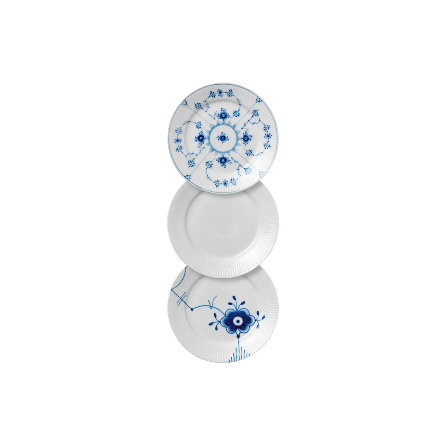 Dette Gifts with History-sæt med tre 19 cm tallerkener forener nogle af Royal Copenhagens mest populære stel – Hvid Riflet, Blå Mega Riflet og Musselmalet Riflet – og sætter det historiske og det kontemporære side om side med hinanden. Tallerkenerne er perfekte til frokost eller dessert, og sættet er en skøn gaveide.