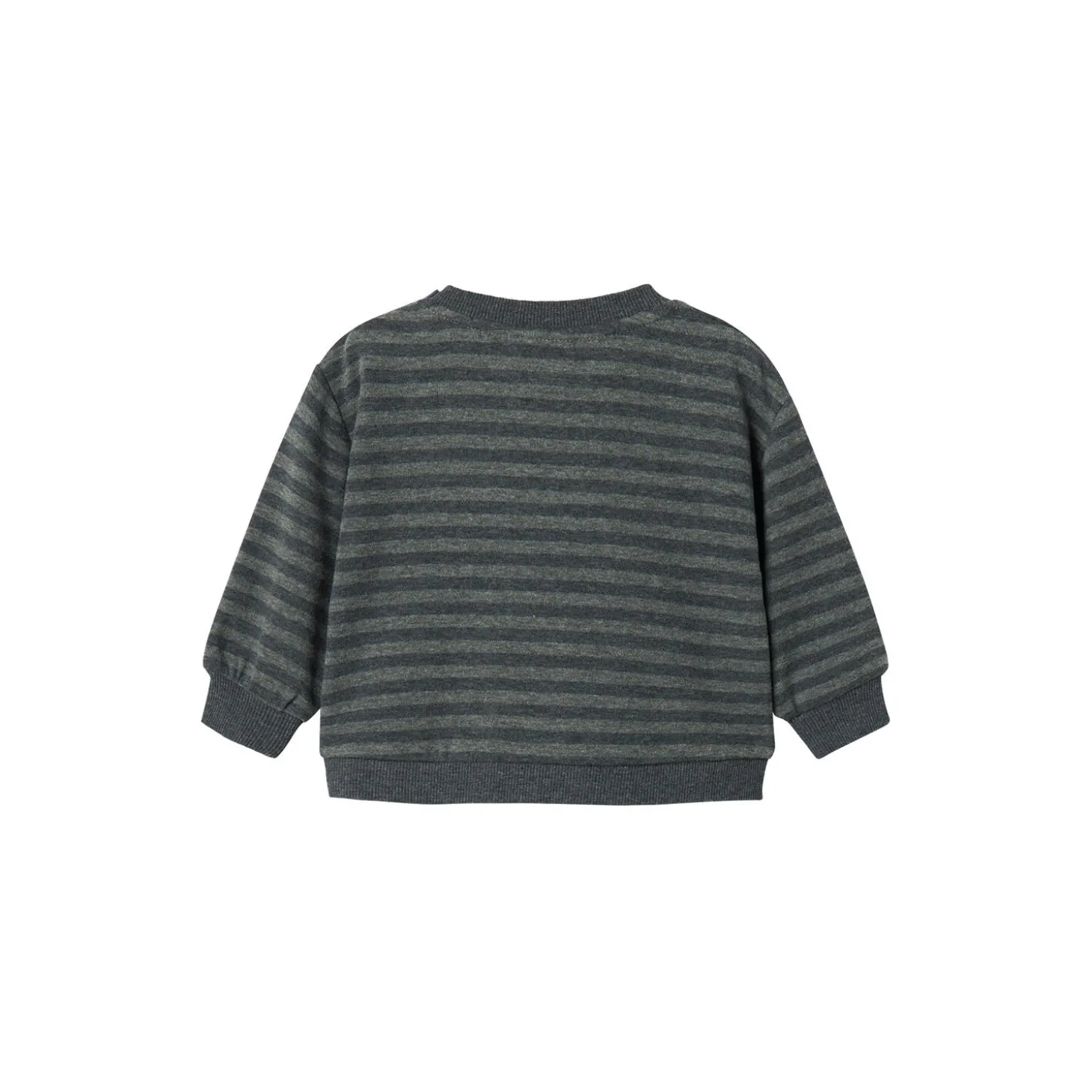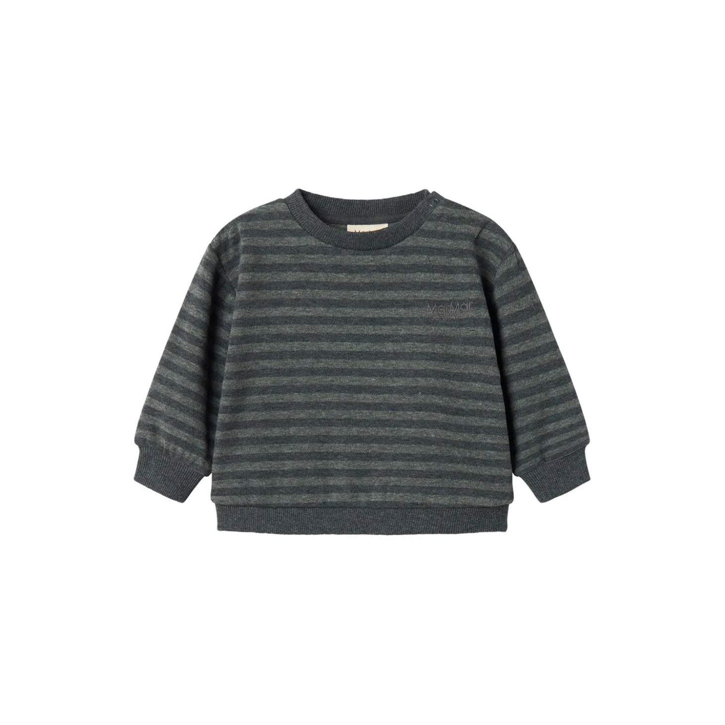 Blød baby sweatshirt med logo broderi samt rib i hals, ærmer samt rundt i livet. Sweatshirten har tryk knaplukning foran på venstre skulder.