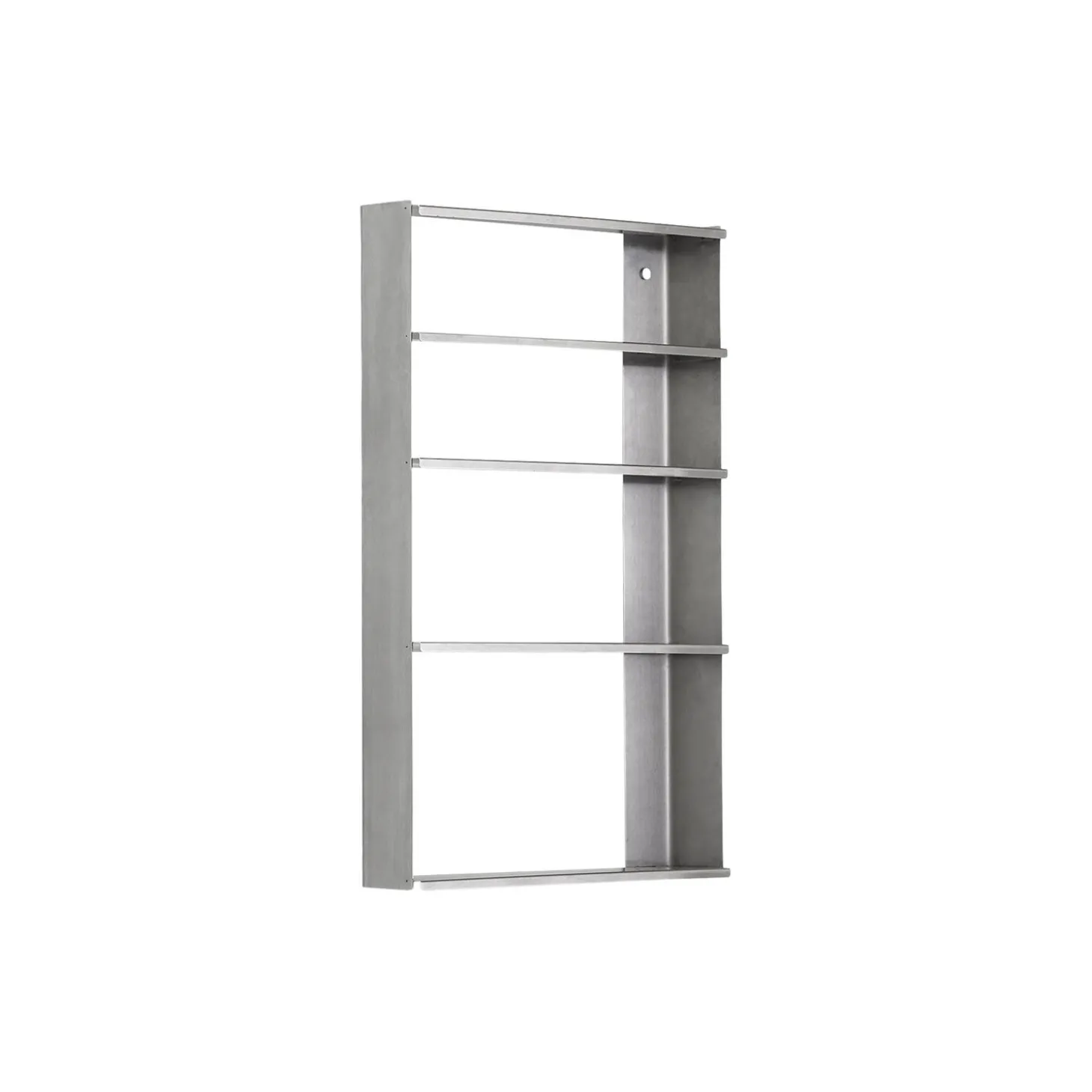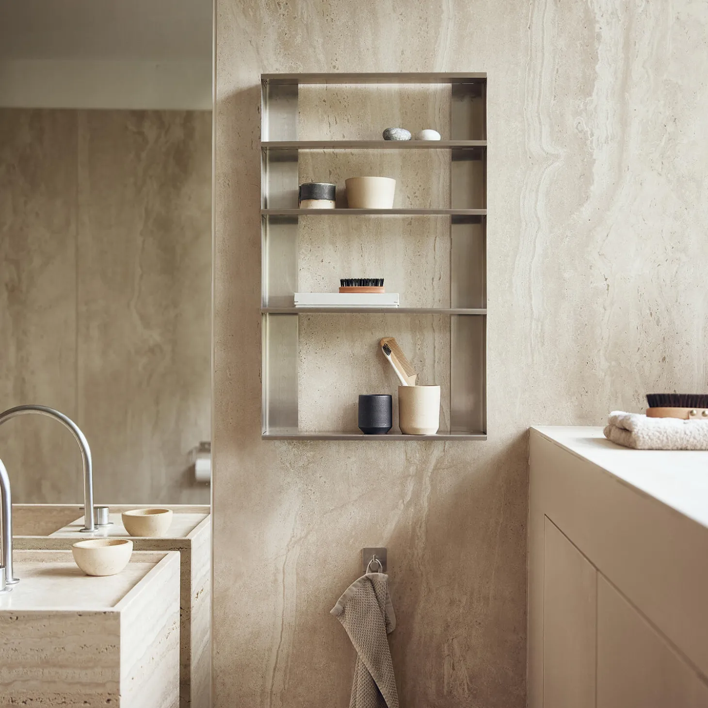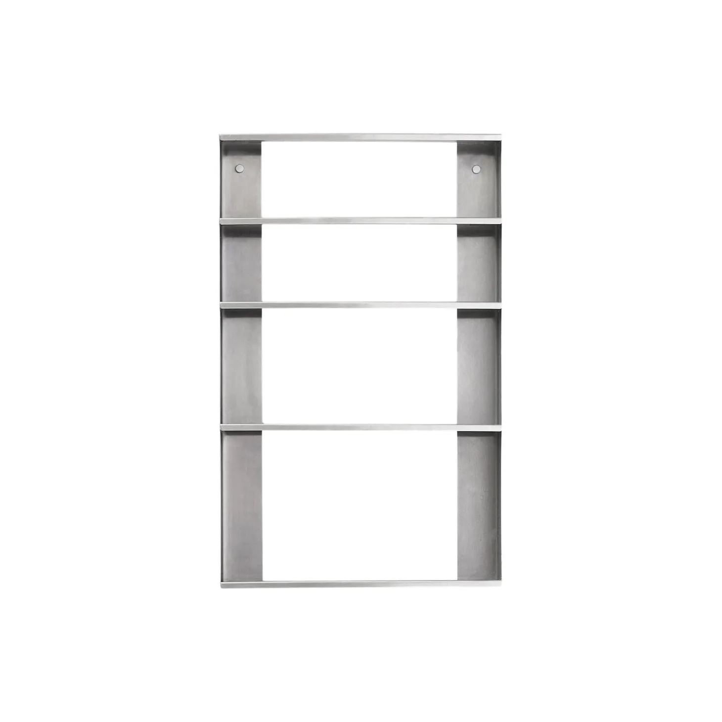 En smukt minimalistisk, men rummelig reol, som giver praktisk opbevaringsplads og passer ind hvor som helst, fra køkken eller bad til stue, entre eller kontor. De vinklede beslag bag på reolen giver en god, stabil ophængning uden at forstyrre det åbne formsprog.Hyldernes afrundede kanter fremhæver detaljeringen af de enkelte elementer og skaber en fin, glat afslutning på de rå stålprofiler. Med sin minimale dybde er denne funktionelle reol et elegant møbel, hvor man kan fremvise sine yndlingsobjekter eller tømme lommerne for nøgler, mønter og andre småting.