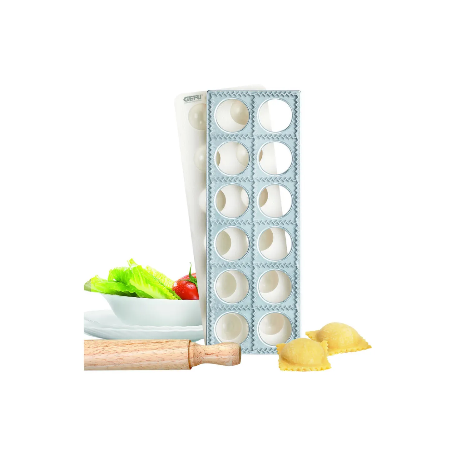 Til tilberedelse af større mængder Ravioli. Bare læk et lag dej med mel på ud over ravioliformen og pres plastikformen ned over. Tilsæt din ønskede fyld og rul den medfølgende ruller over med let pres. Så kan du vende formen på hovedet og let fjerne dine raviolistykker.