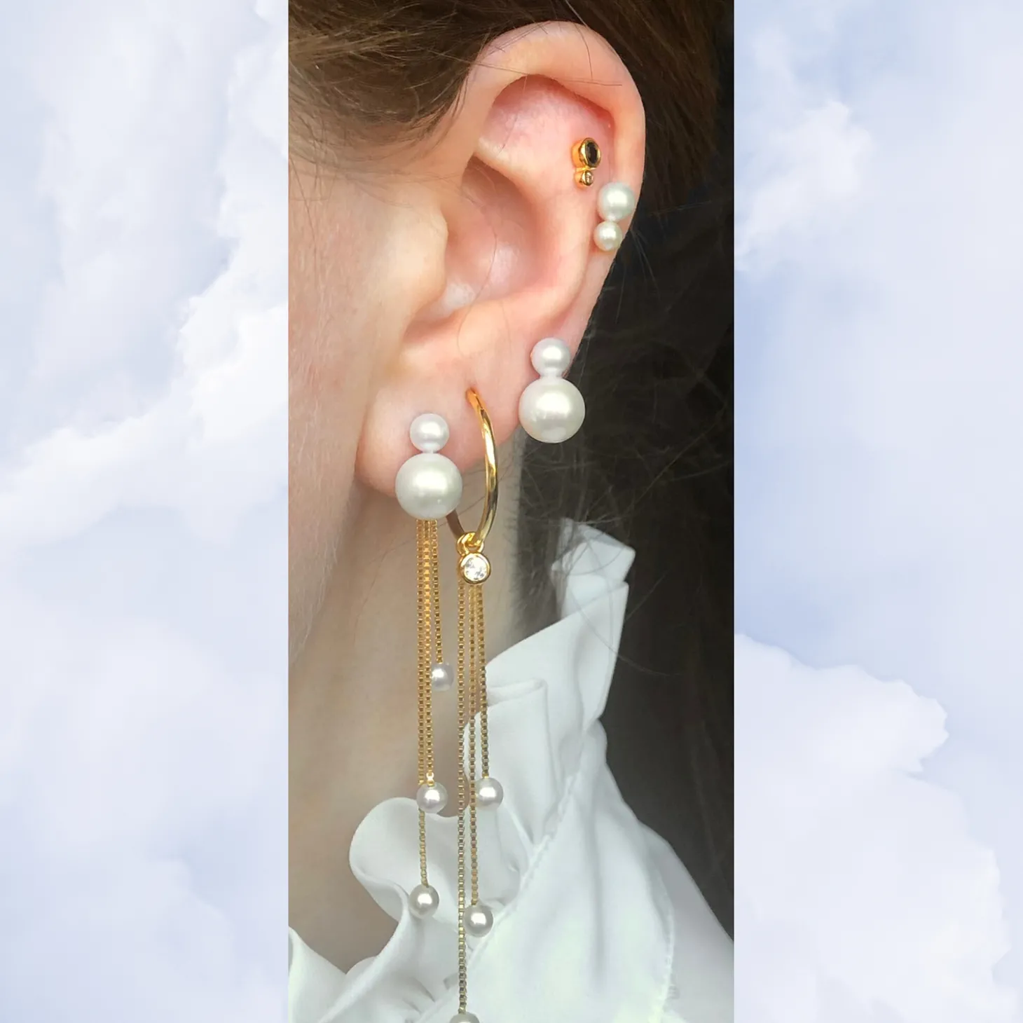 Charm med kæder og hvide ferskvandsperler som passer til alle The Earring Shops ørestikker og hoops. Ringen placeres på ørestikken bag på øret inden låsen sættes på eller på en hoop. Sælges enkeltvis.