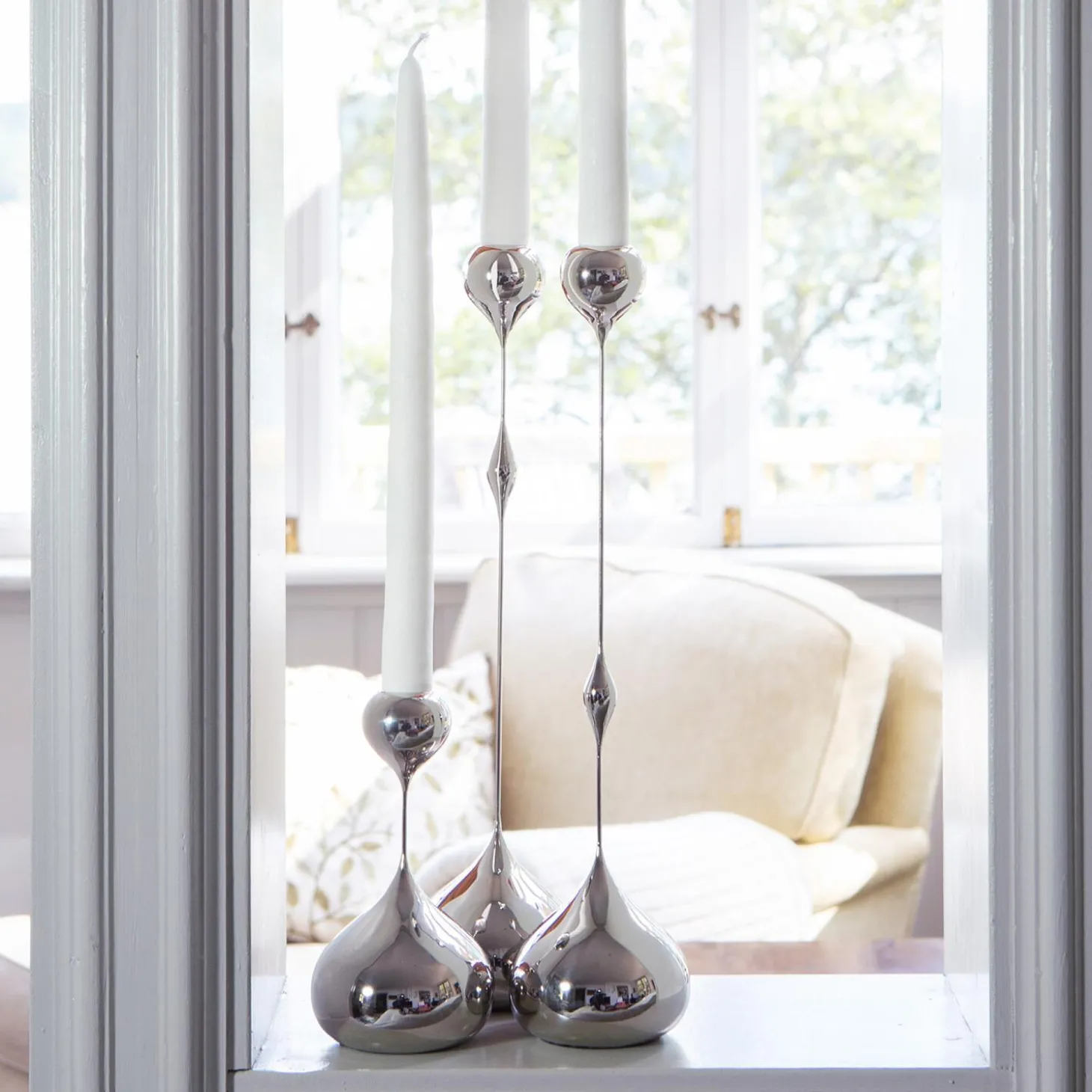 The thin silhouette of the Tender candlestick collection is inspired by Alberto Giacometti’s elongated sculptures, and how backlight can seemingly whittle down a shape to the slenderest proportions. They are made of brass with a nickel plated surface or with an added black finish. Available in one short and two tall versions.