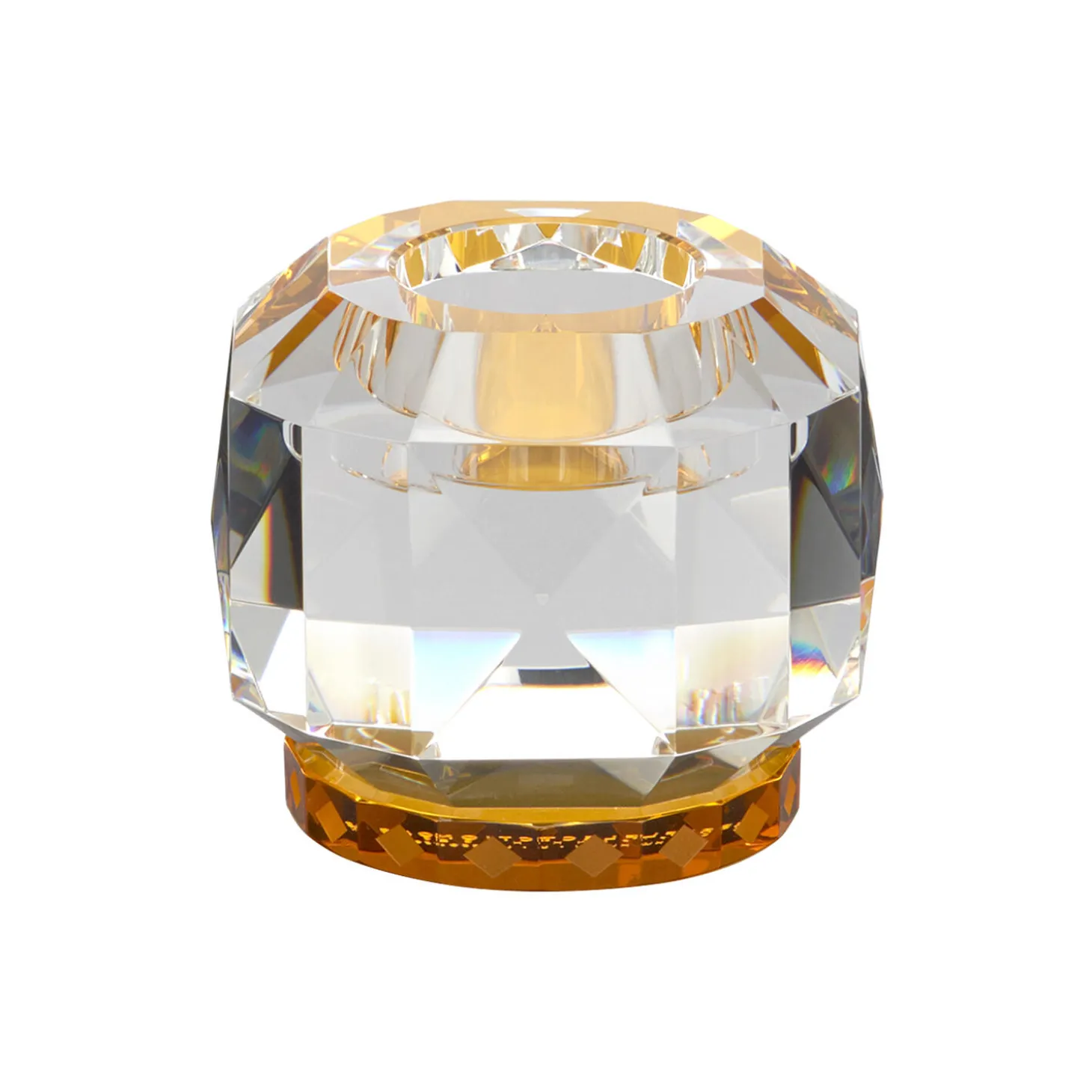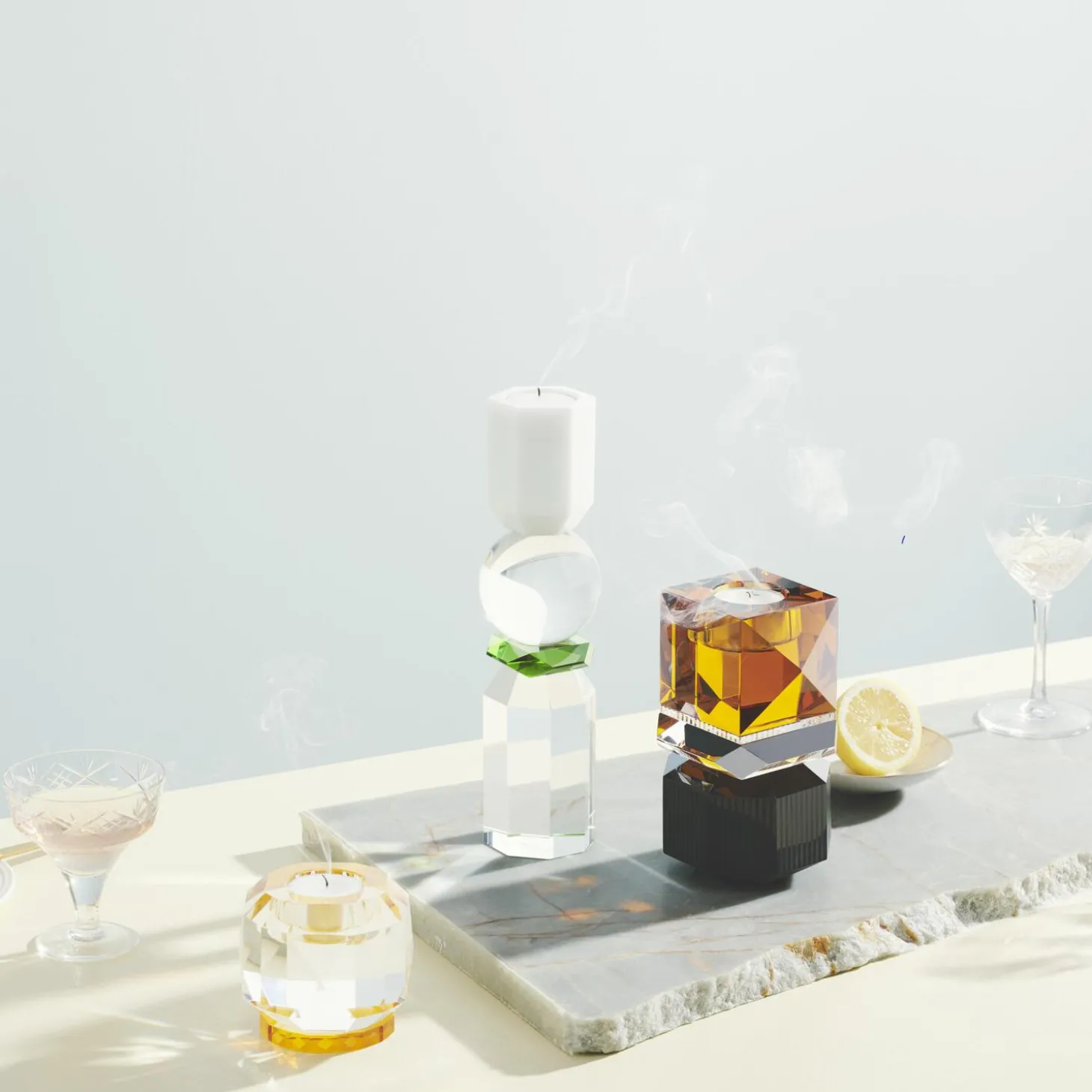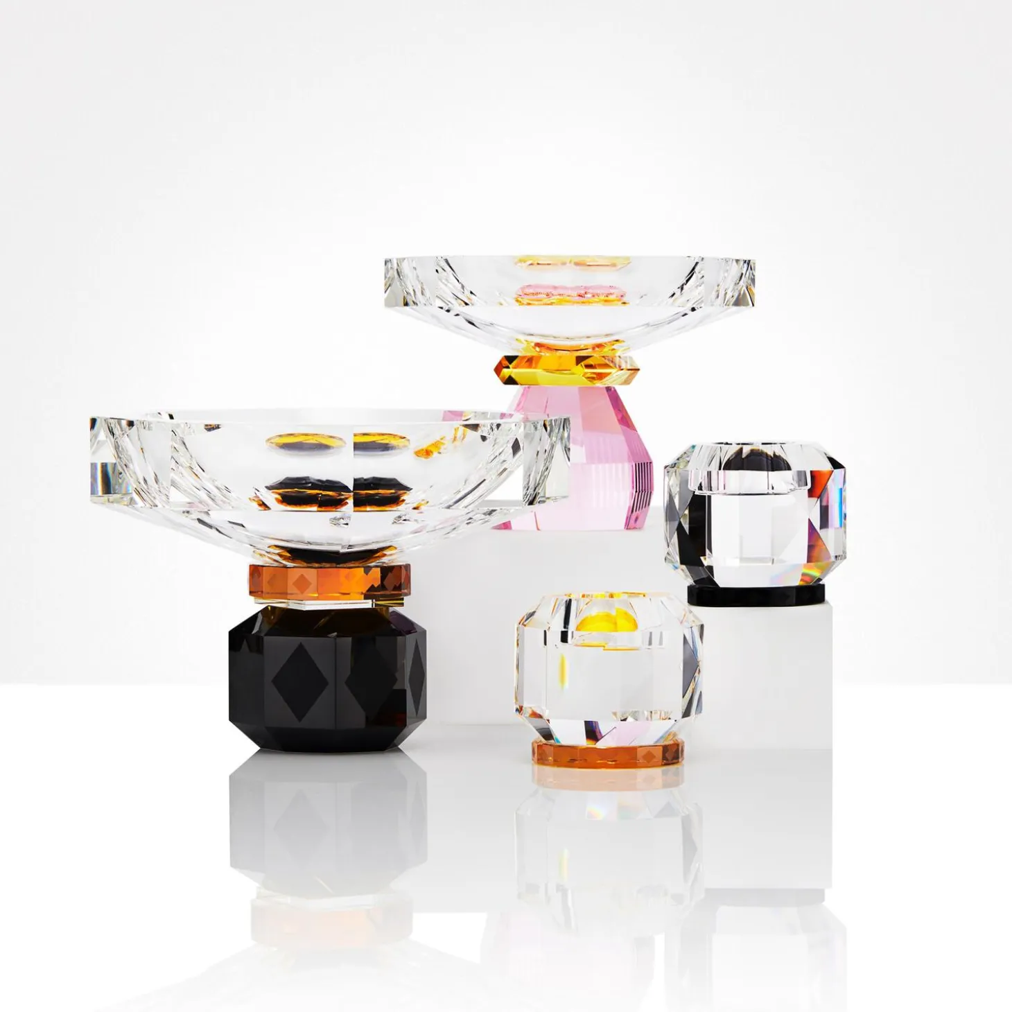 Denne elegante fyrfadsstage kommer i fem forskellige farvekombinationer og er inspireret af 1920’ernes luksuriøse æra. Fyrfadsstagen er lavet ud af ren, håndskåret krystal og formet i geometriske og juvellignende former. Når der tændes lys i fyrfadsstagen, skyder lyset yndefuldt gennem de farvede krystaller og skaber en blød belysning.