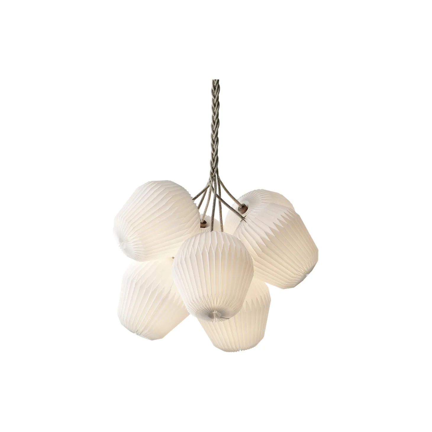 The Bouquet 7 lysekrone med standardskærme i plast, hør og eg fra LE KLINT. Farve: hvid/eg. Mål: H: 85 x Ø 85 cm. Størrelse: L. Lyskilde: maks. 10W E14. Design: Sinja Svarrer Damkjær.