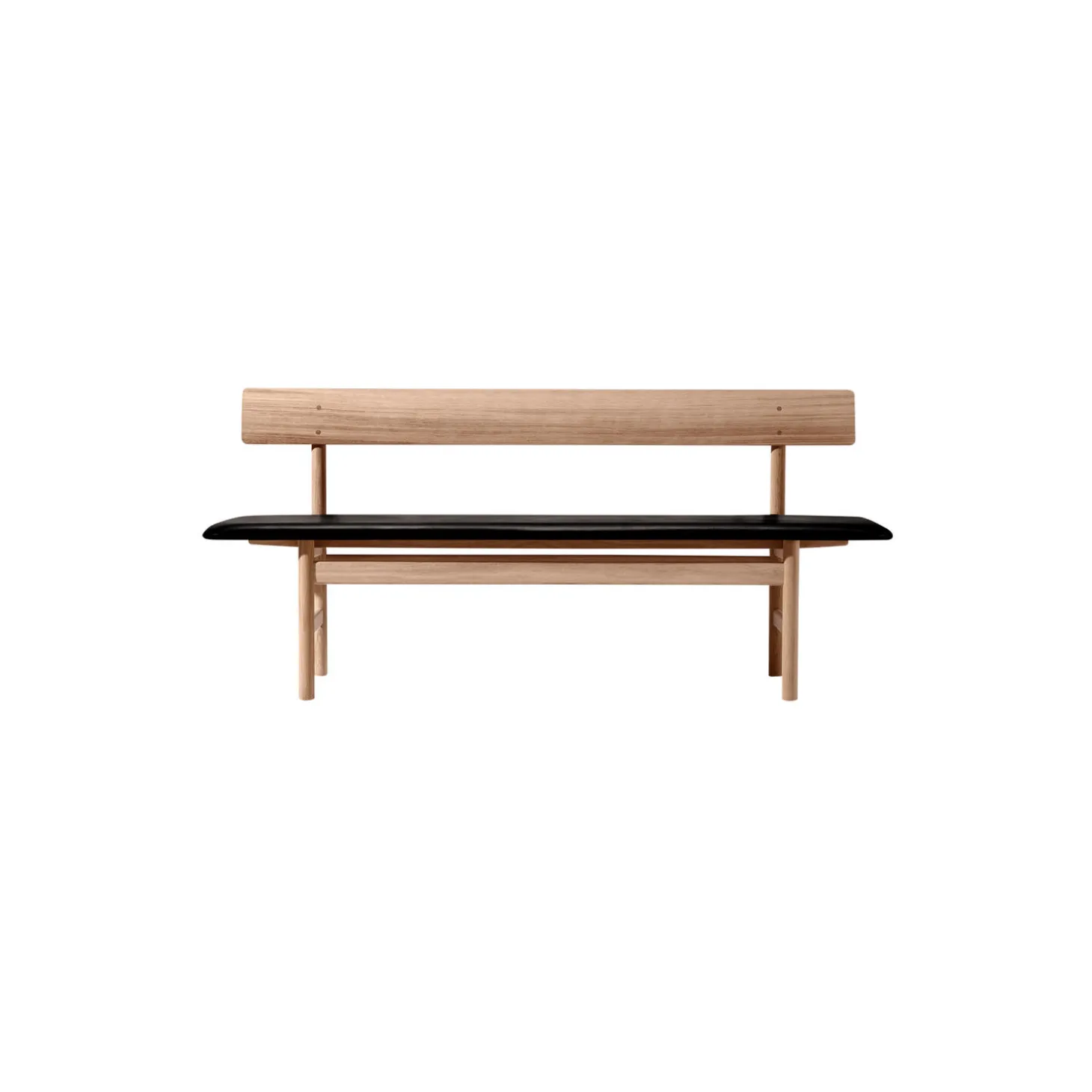 The Mogensen Bench bænk i olieret eg med sædepolstring i Omni semianilinlæder 301 fra Fredericia. Farve: olieret eg/black. Mål: H: 77 x L: 171,5 x D: 48,5 cm. Siddehøjde: 46 cm. Design: Børge Mogensen.