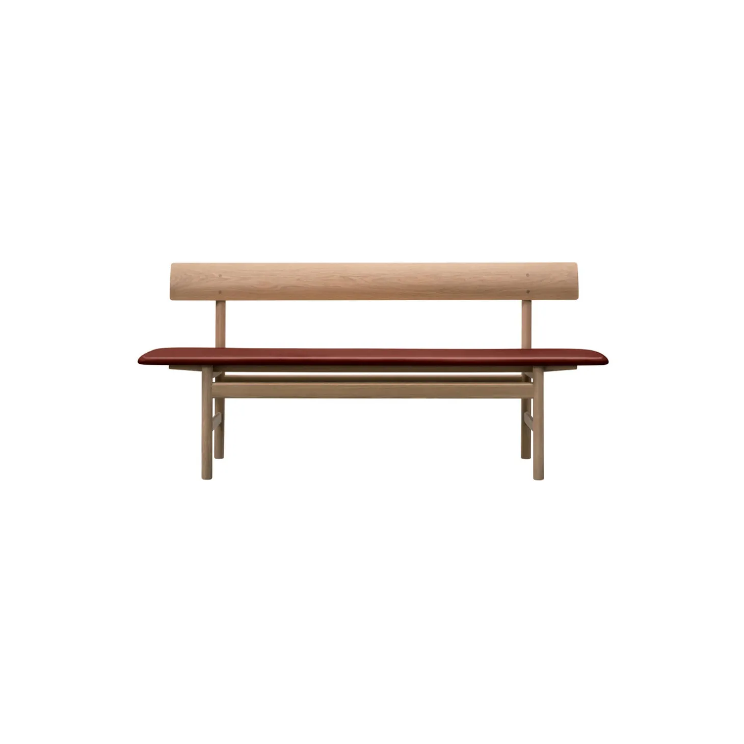The Mogensen Bench bænk i olieret eg med sædepolstring i Omni semianilinlæder 293 fra Fredericia. Farve: olieret eg/burnt sienna. Mål: H: 77 x L: 171,5 x D: 48,5 cm. Siddehøjde: 46 cm. Design: Børge Mogensen.