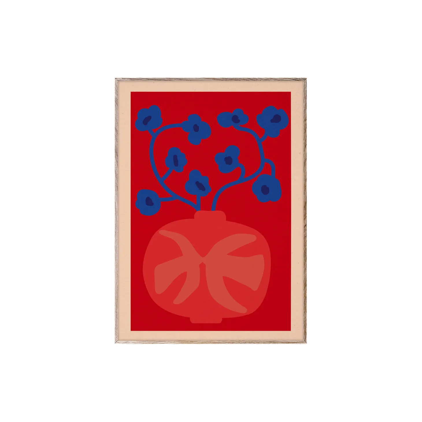 The Red Vase by Netherlands based artist and designer Anne Olde Kalter is a celebration of colour, life and positivity. Featuring two kissing bird motifs on the base of the rounded vase, shades of pink and red allow the bold blue flowers to almost jump out of the frame. Full of rounded and organic forms, the composition pulls from the open skies and rolling hills of Kalter’s home in the Dutch countryside. Frame not included.