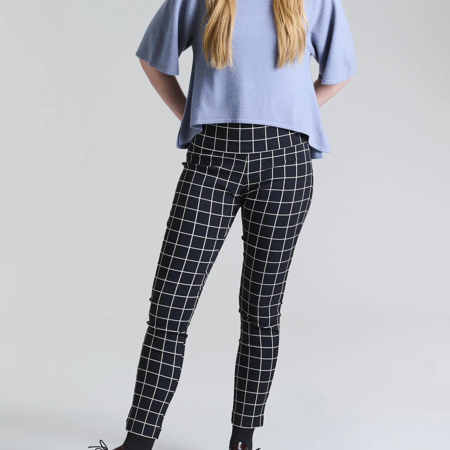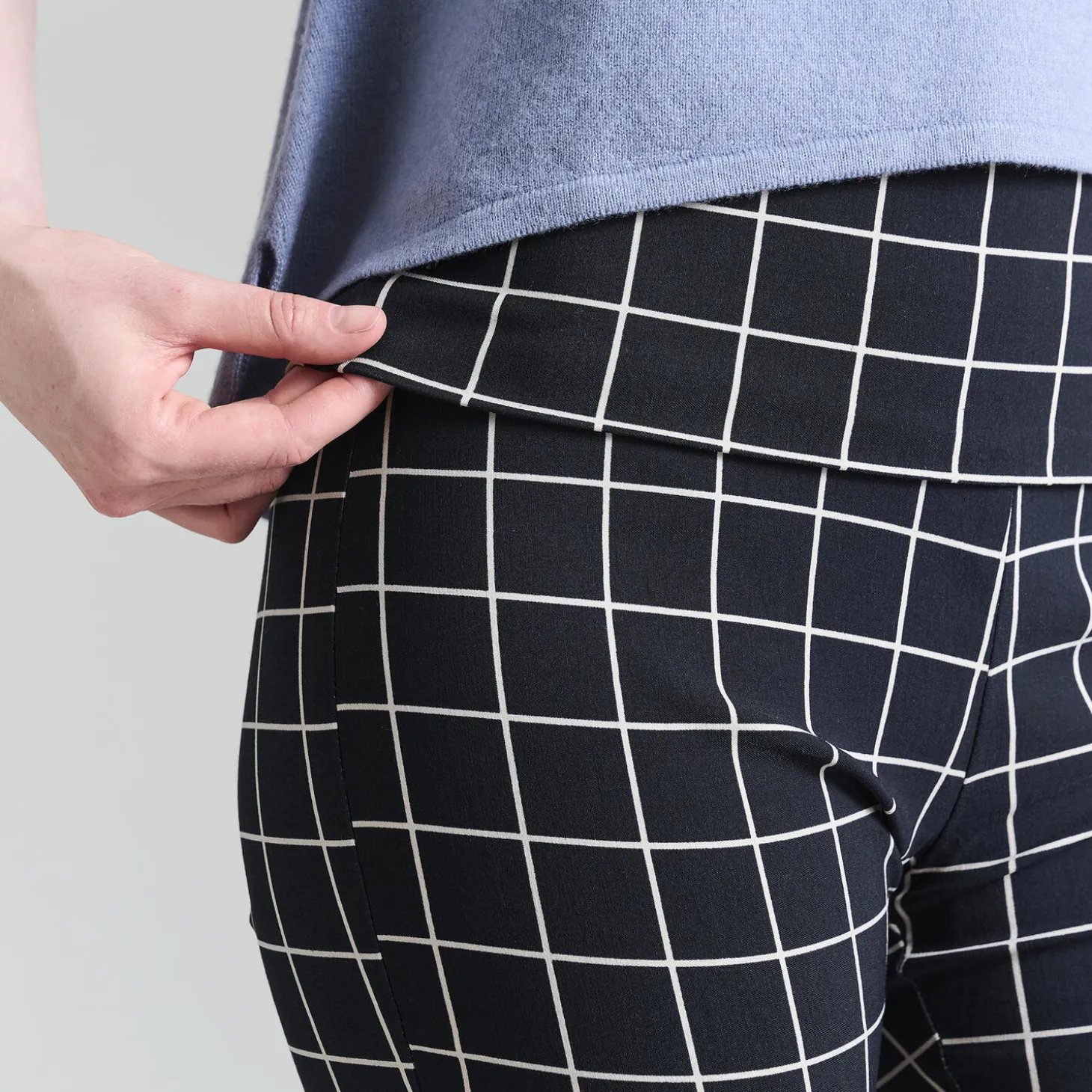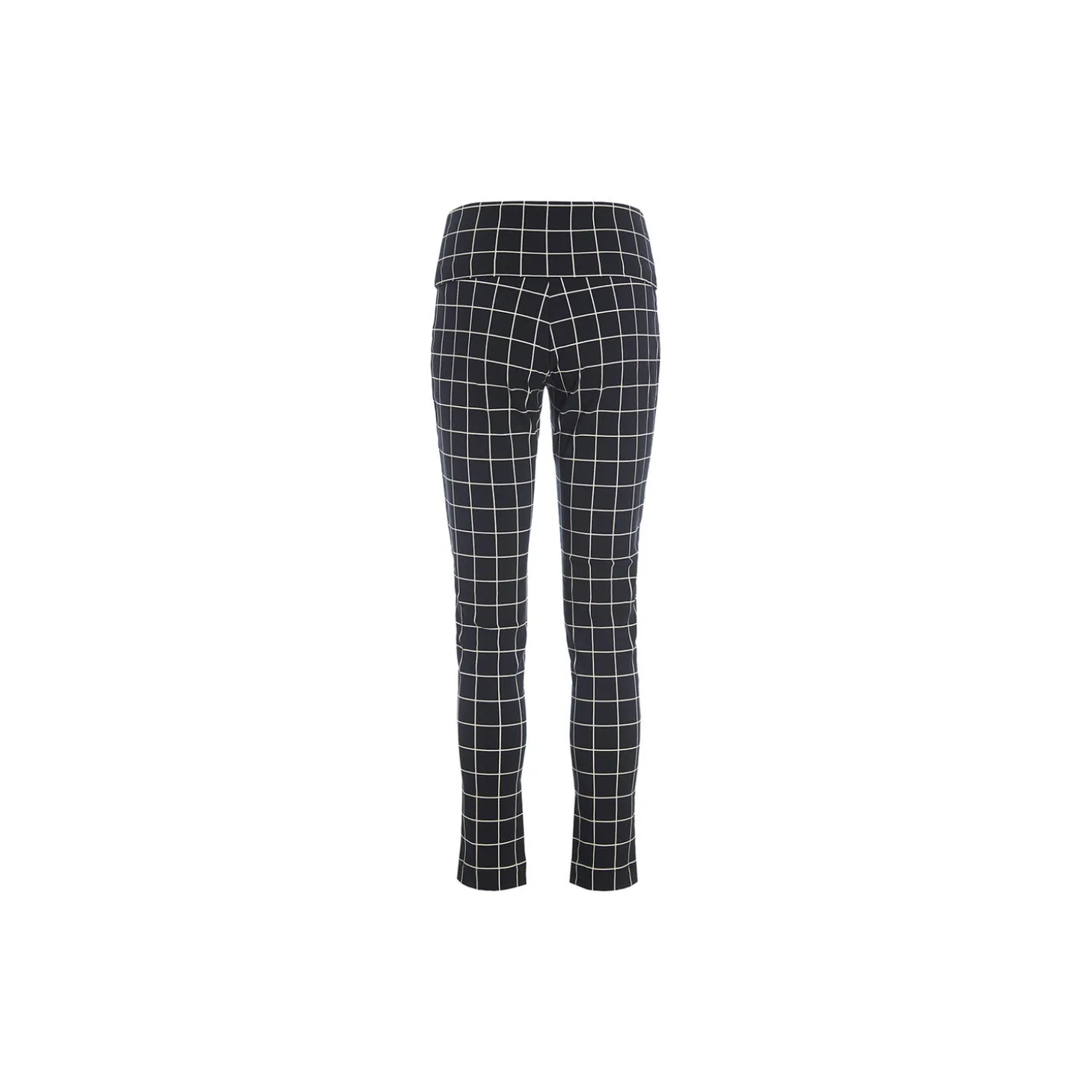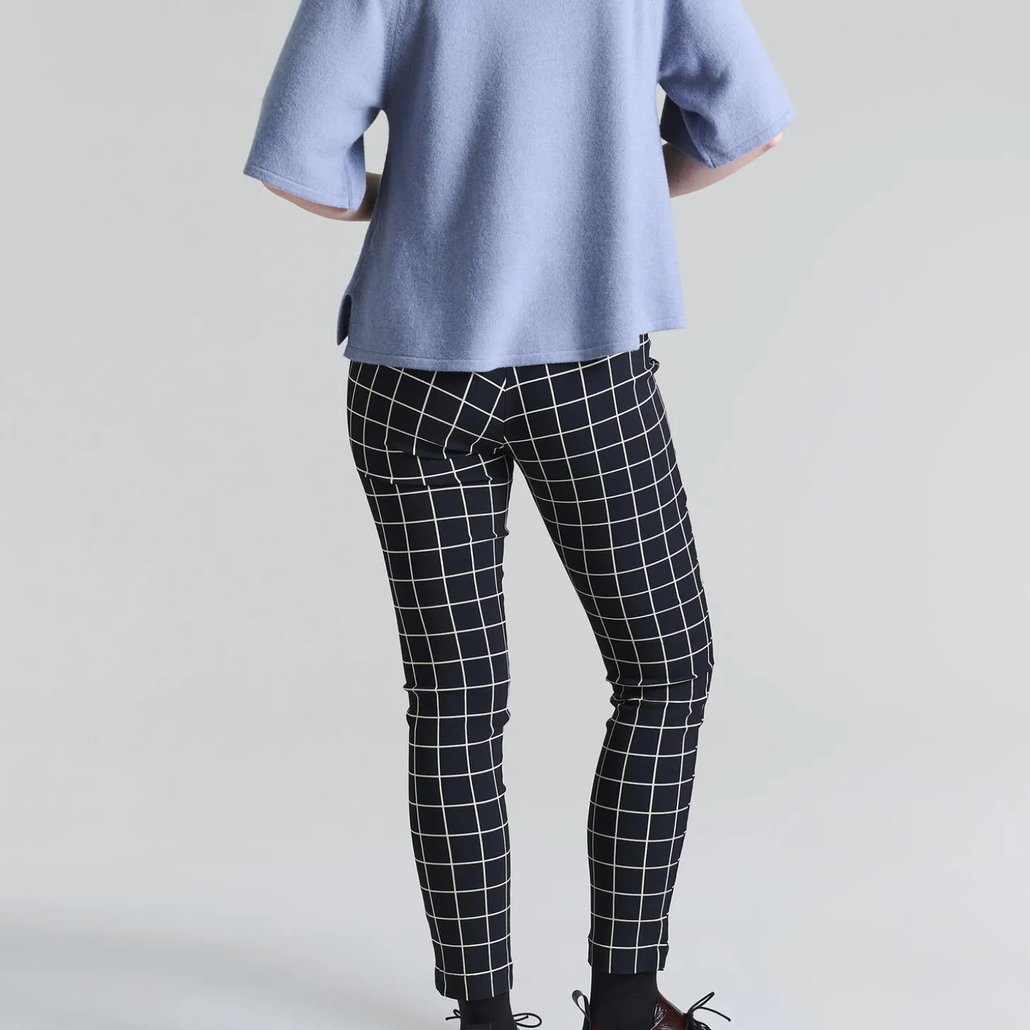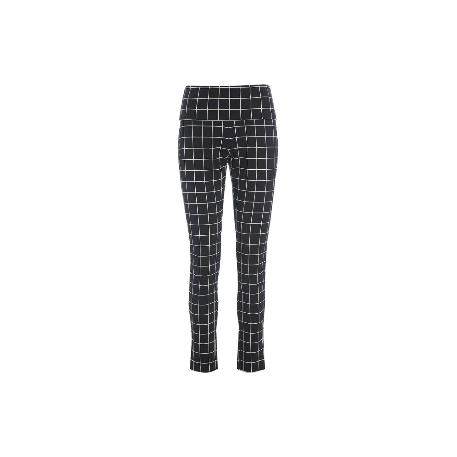 Meget behagelige og smarte bukser med grafisk sort/hvid tern. Bukserne er tætsiddende, og der er stretch i stoffet, hvilket sikrer god bevægelighed. Den brede linning kan trækkes op over maven eller foldes ned for en almindelig taljehøjde.