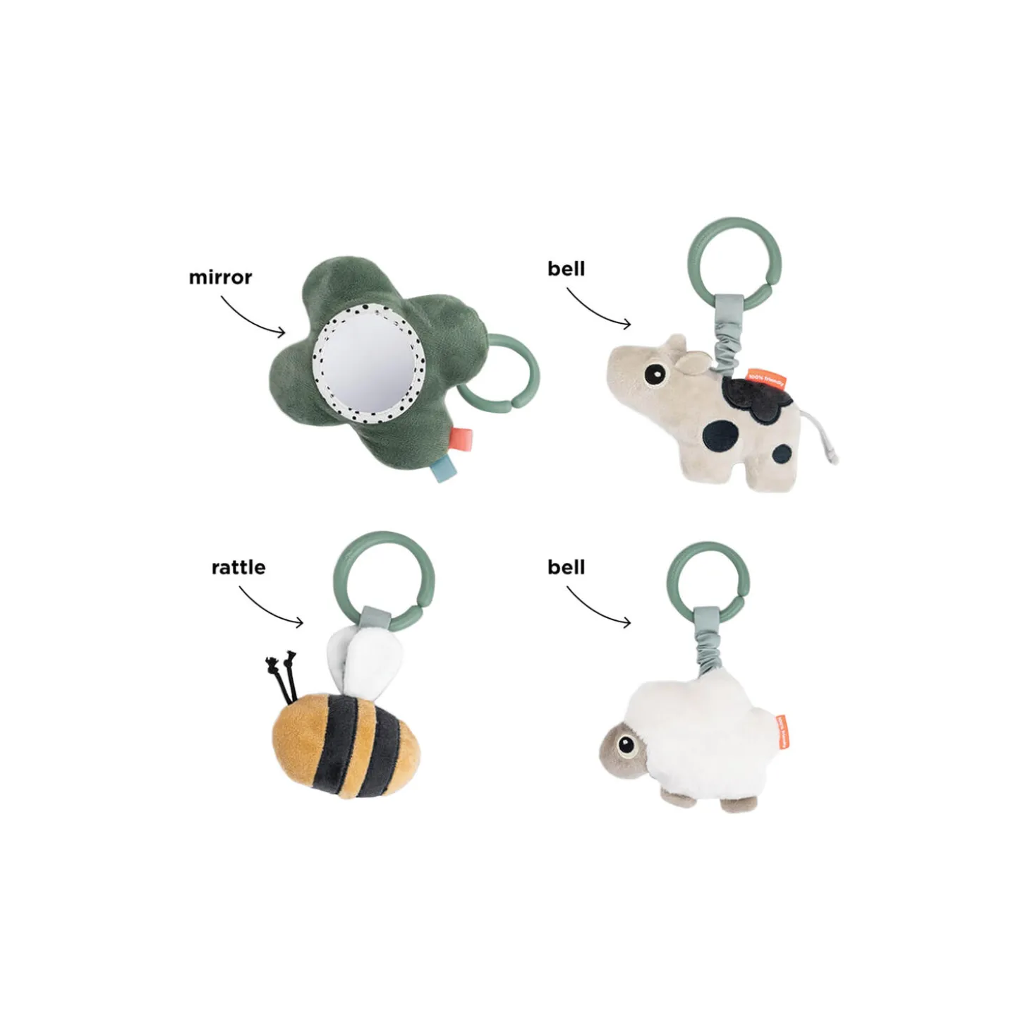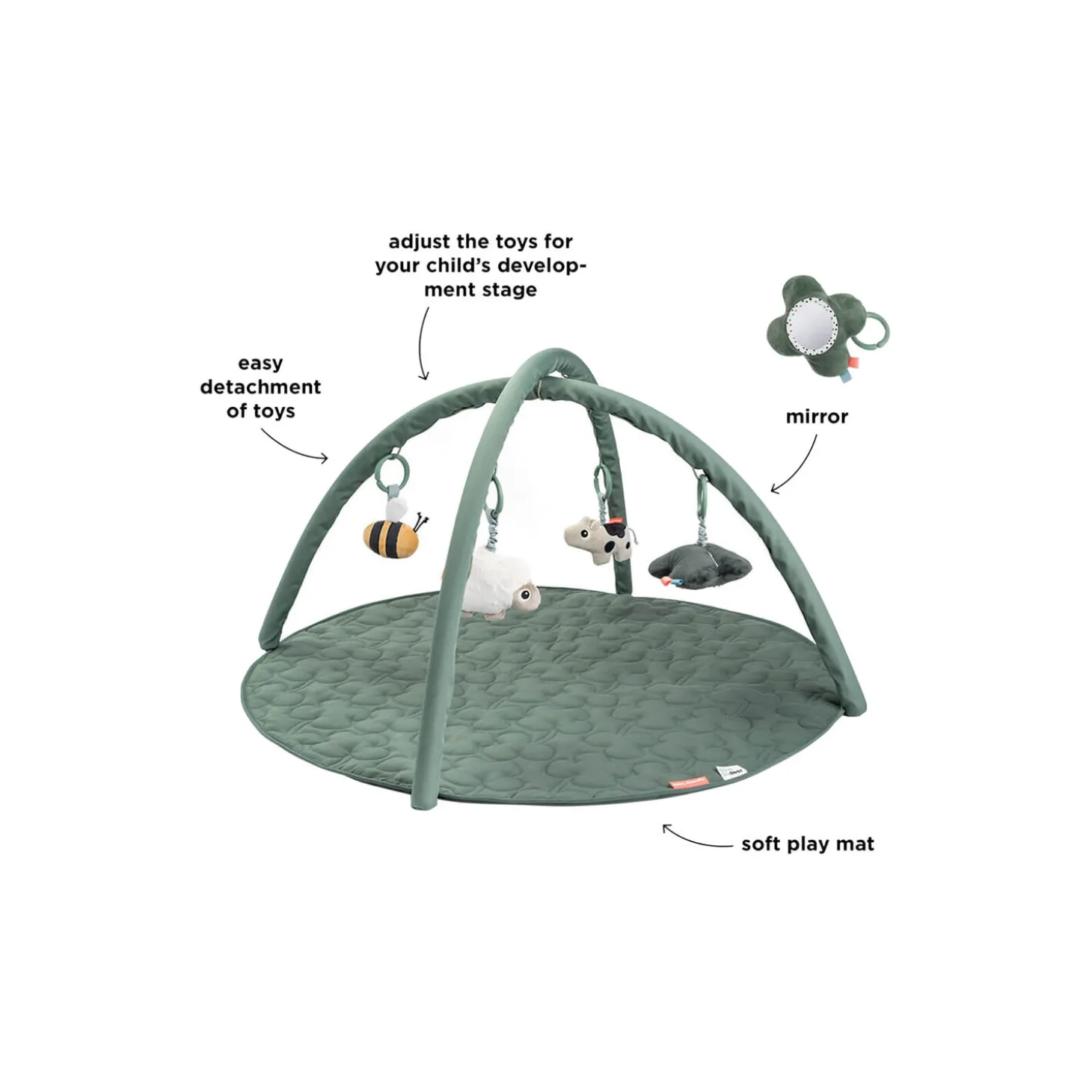 • Sensoriske elementer som en rangle, en klokke, knitren og et spejl vil stimulere dit barns hørelse og taktile sans• Tilpas de fire hængende stykker legetøj til dit barns udviklingstrin • Tag legetøjet ned og brug individuelt for at give små fingre mulighed for at udforske• Blød, vatteret legemåtte med søde skyer i tyk polstring• Seje grønne nuancer og sjove kontrastfarver for visuel stimulering• Lad de Deer friends underholde din baby, når det er legetid