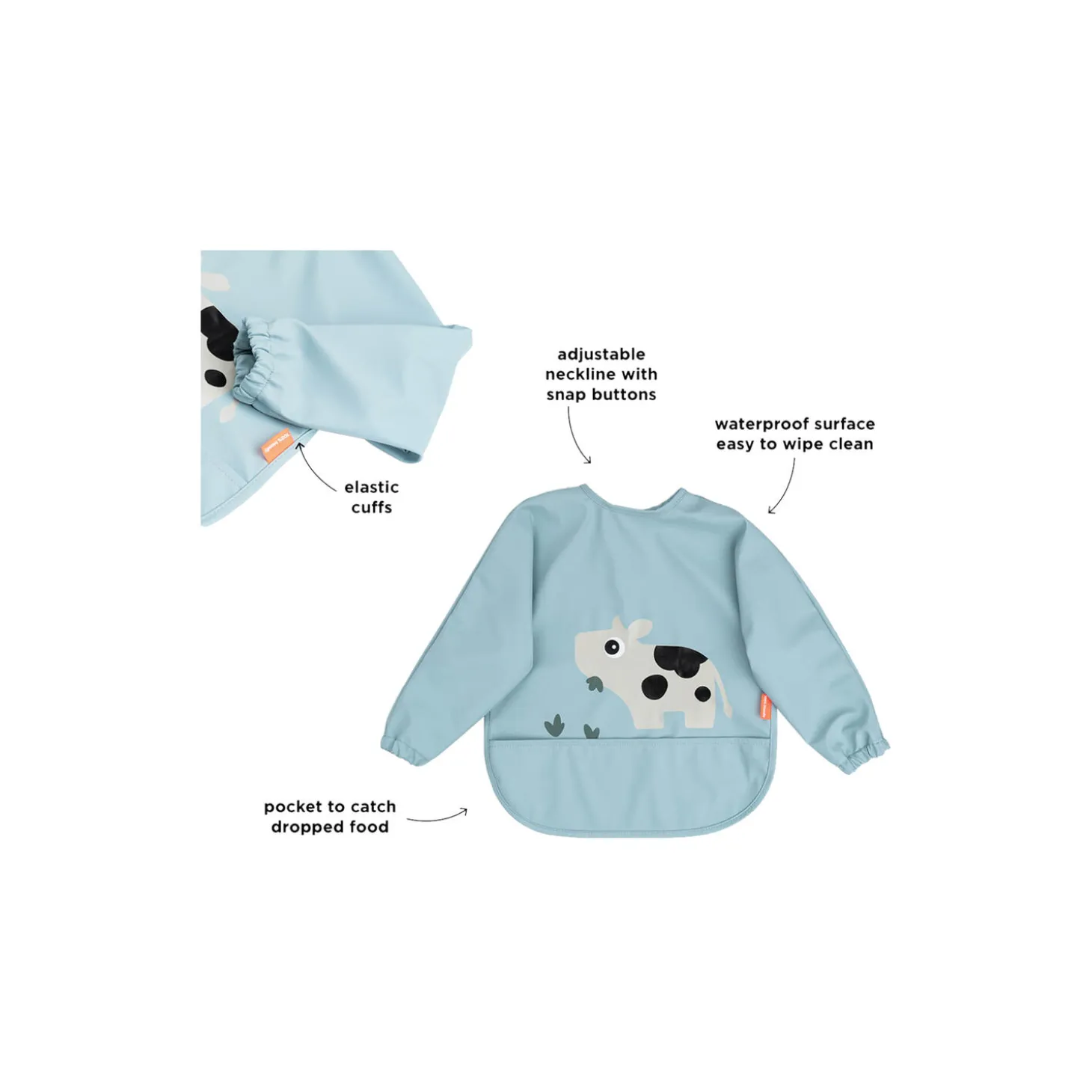 • Hagesmæk med ærmer og en lomme til at fange tabt mad• Den vandafvisende overflade beskytter tøj og gør den let at rengøre• Justerbar dobbelt-lukning for en god pasform• Skøn blå farve med et underholdende motiv af Dotti