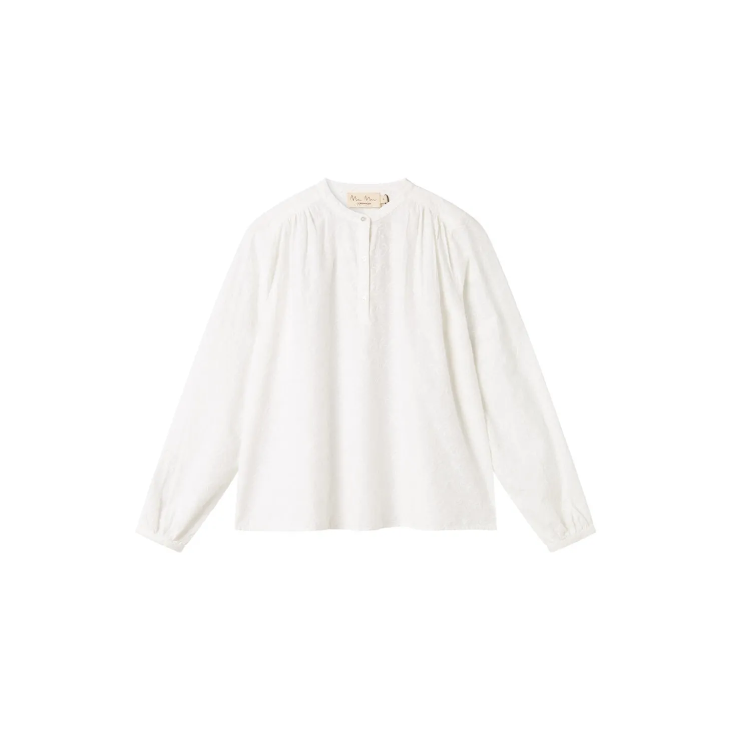 Langærmet skjortebluse med rund hals, broderede sløjfer og knaplukning foran.