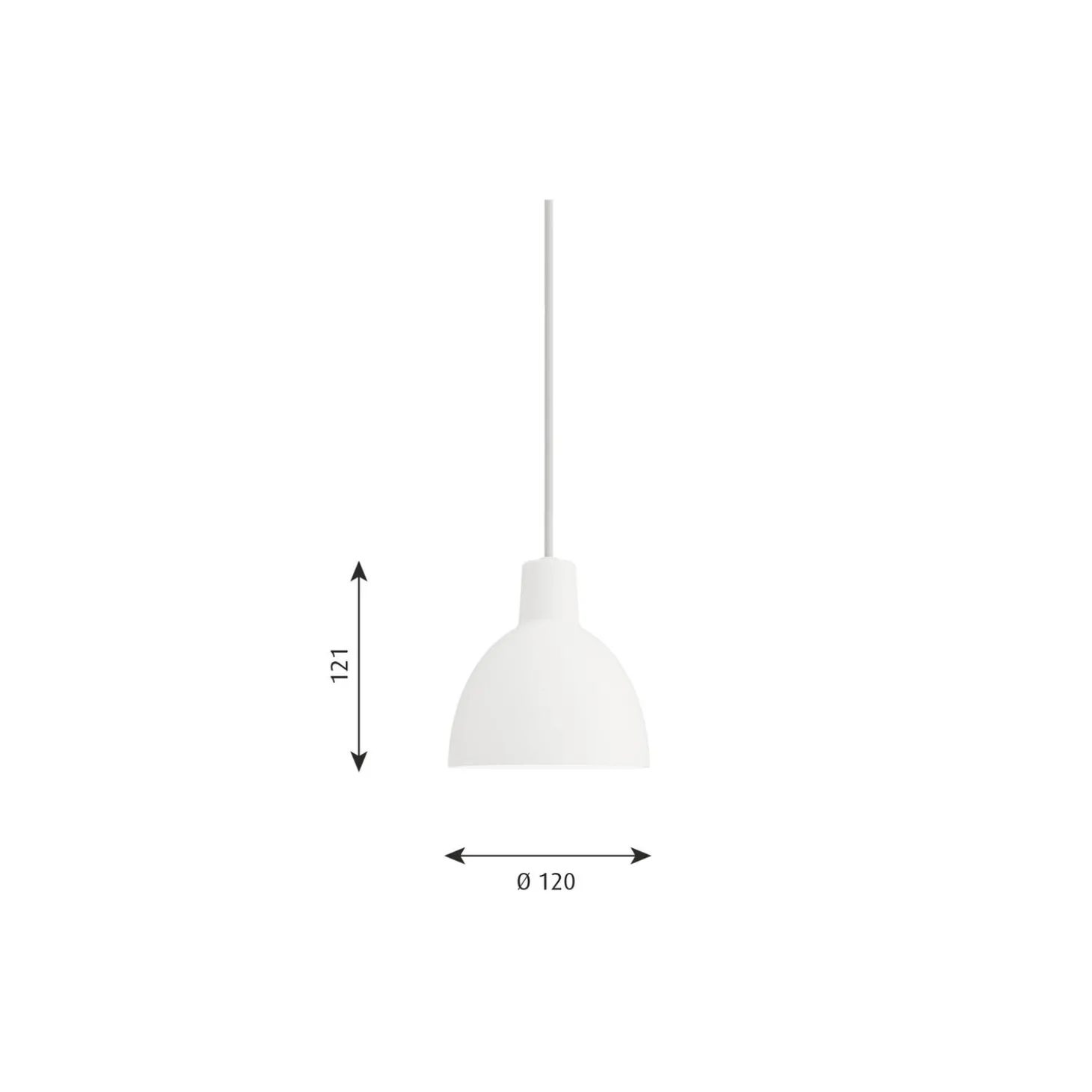 Toldbod 120 pendel i optrykt matlakeret aluminium fra Louis Poulsen. Farve: hvid. Mål: H: 12,1 x Ø 12 cm. Lyskilde: 33W G9. Design: Louis Poulsen A/S.