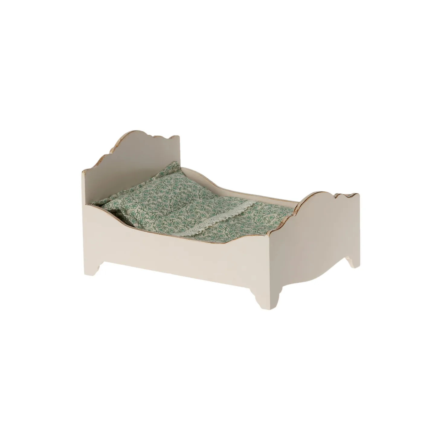 Musene kan nu nyde en god nats søvn i denne træseng. Der er en dejlig madras og linned i unikke Maileg print. Sengen passer mus op til storesøster og storebror størrelse.