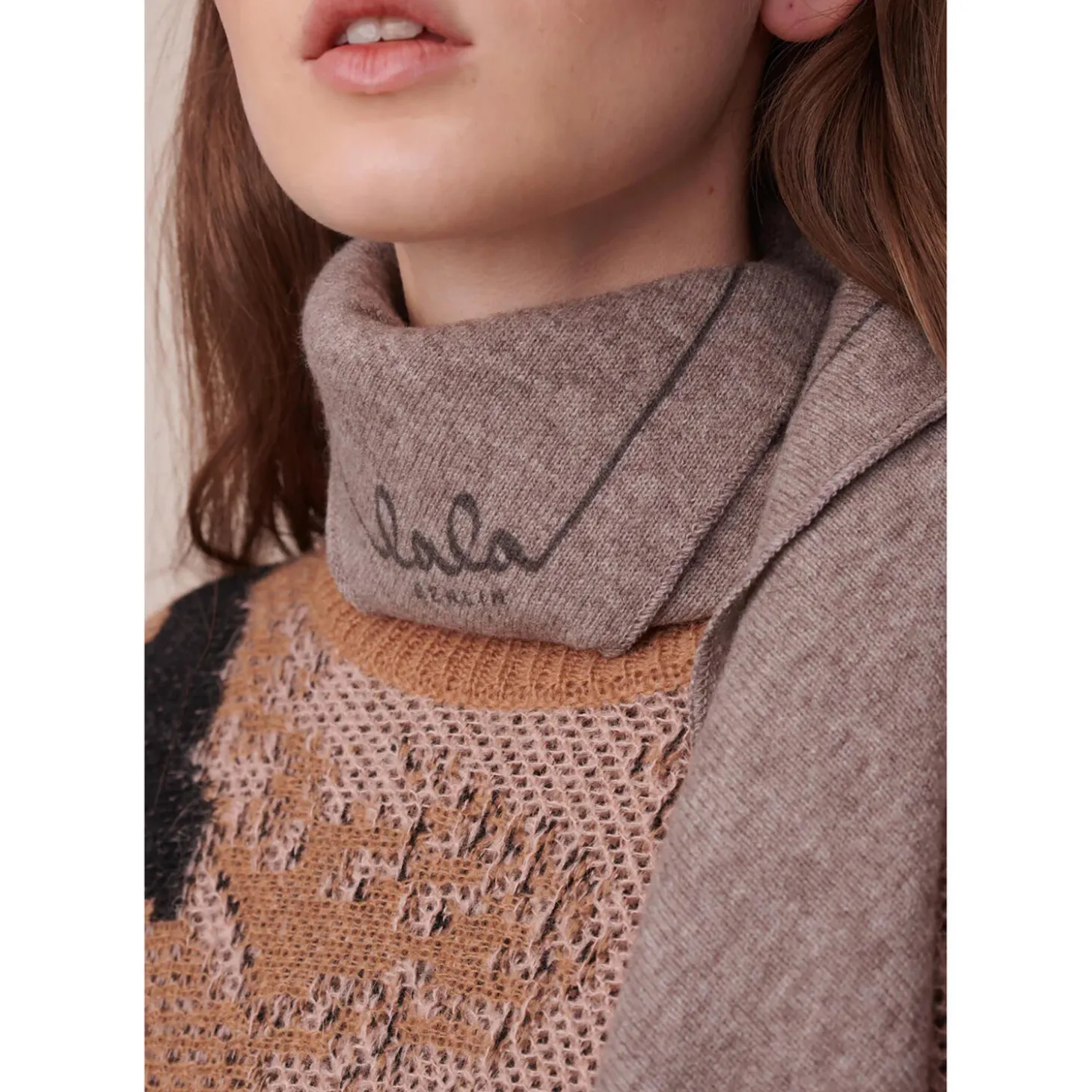 A new take on our luxuriosly soft, triangle shaped cashmere scarfs, solid in classic colors with a subtle lala Berlin logo.