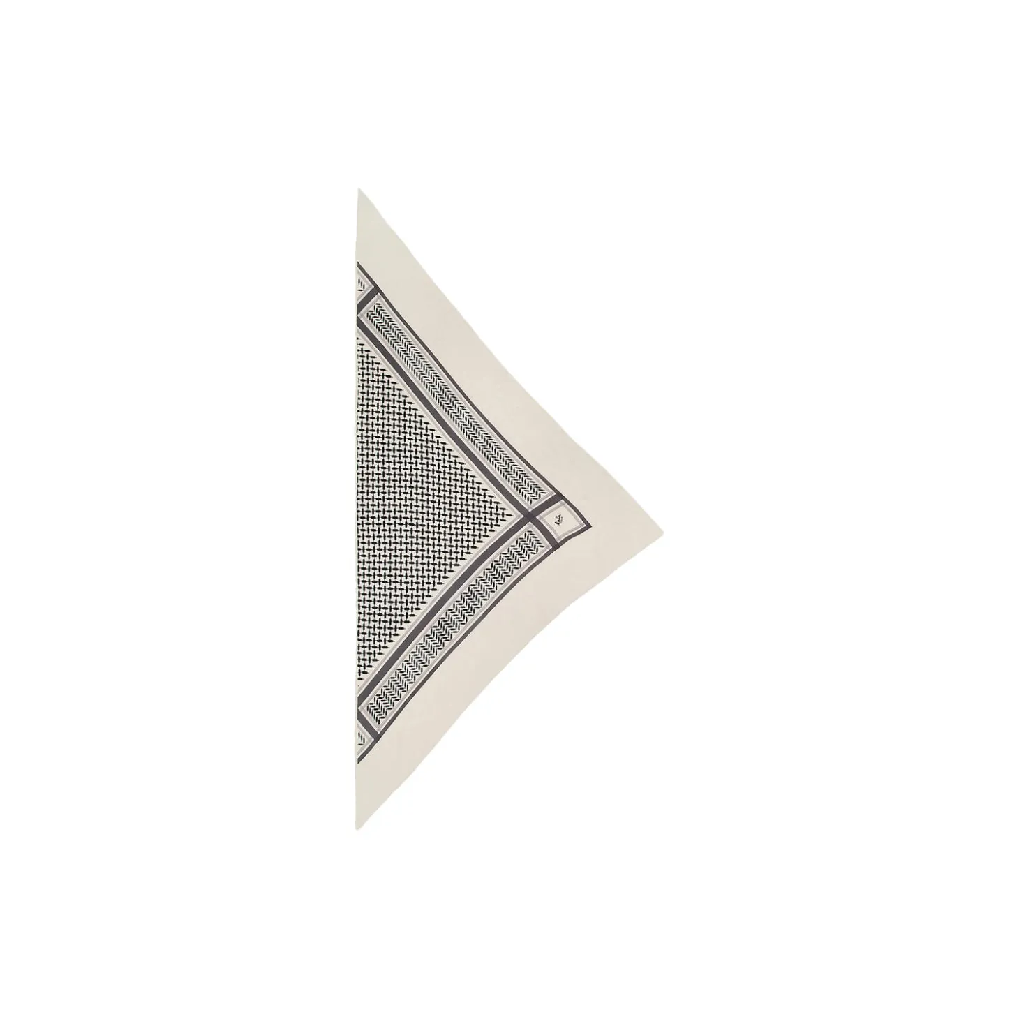 A large luxuriosly soft, triangle shaped cashmere scarf, featuring a classic black Kufiya print on off-white background.