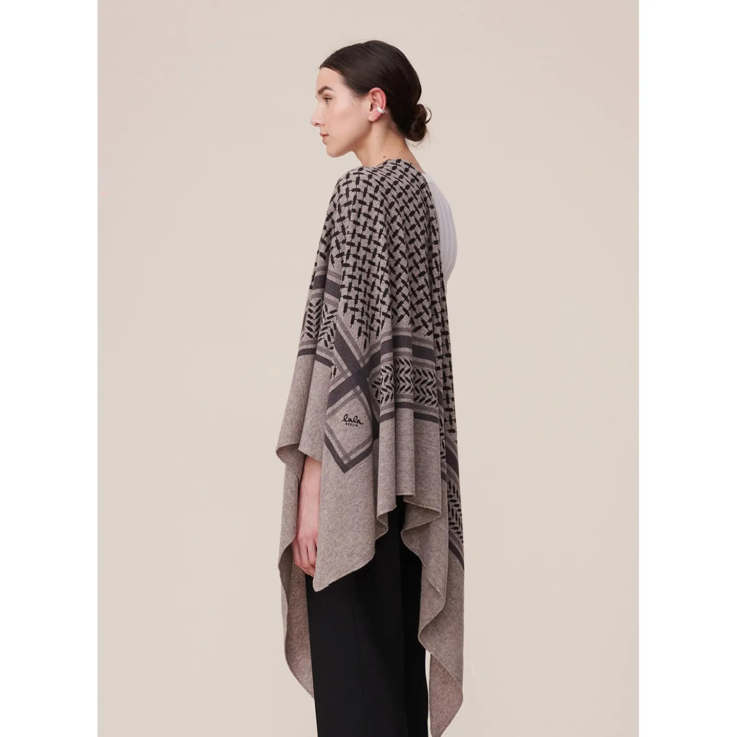 A large luxuriosly soft, triangle shaped cashmere scarf, featuring a classic black Kufiya print on a medium grey background.
