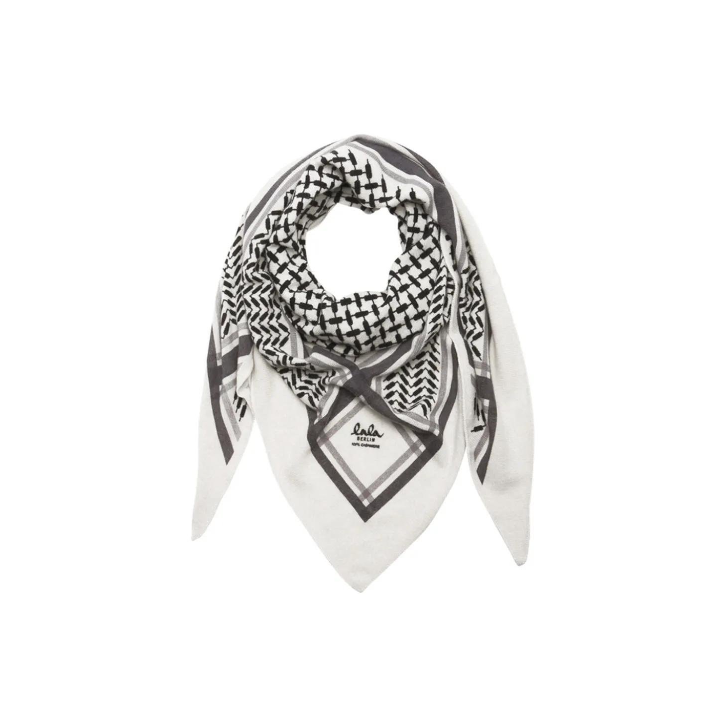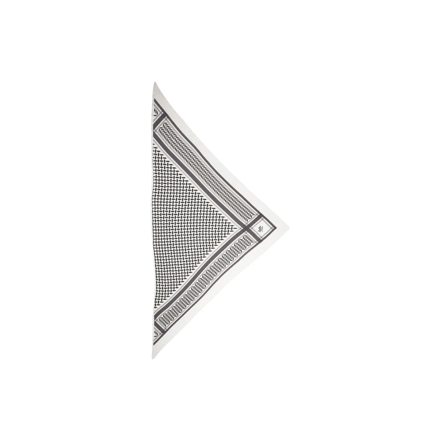 A luxuriosly soft, triangle shaped cashmere scarf, featuring a classic black Kufiya print on off-white background.