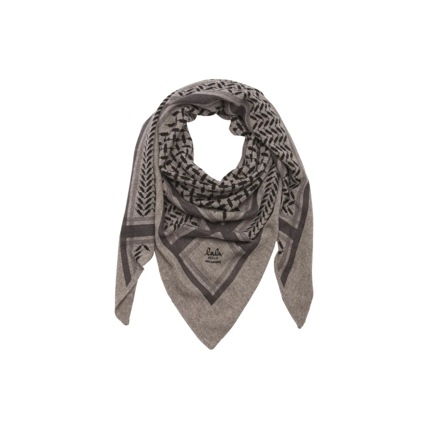 A luxuriosly soft, triangle shaped cashmere scarf, featuring a classic black Kufiya print on off-white background.