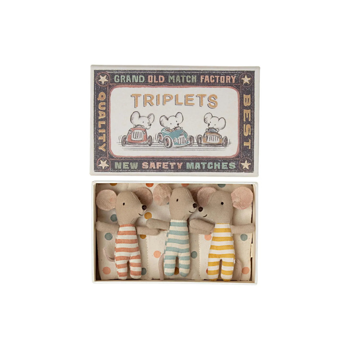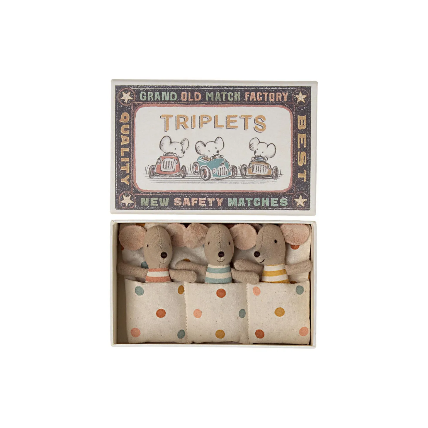 3 små yndige babymus. Trillingemusene er omhyggeligt puttet i deres tændstikæskeseng i en varm sovepose, hvor de sover tæt side om side.