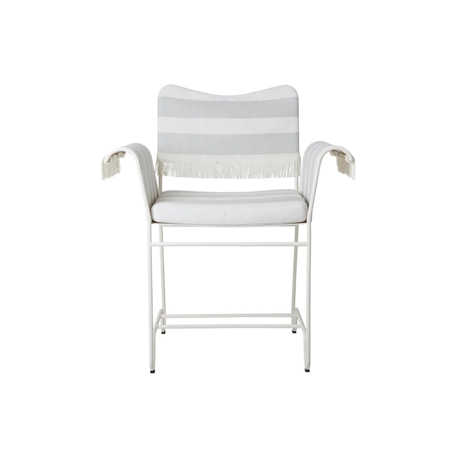 Tropique Dining Chair with Fringes i Leslie Stripe Limonta 20 tekstil, frynser og stel i lakeret rustfrit stål fra GUBI. Farve: Leslie Stripe Limonta 20/classic white semi matt. Mål: H: 86 x B: 71 x D: 58 cm. Siddehøjde: 45 cm. Design: Mathieu Matégot.