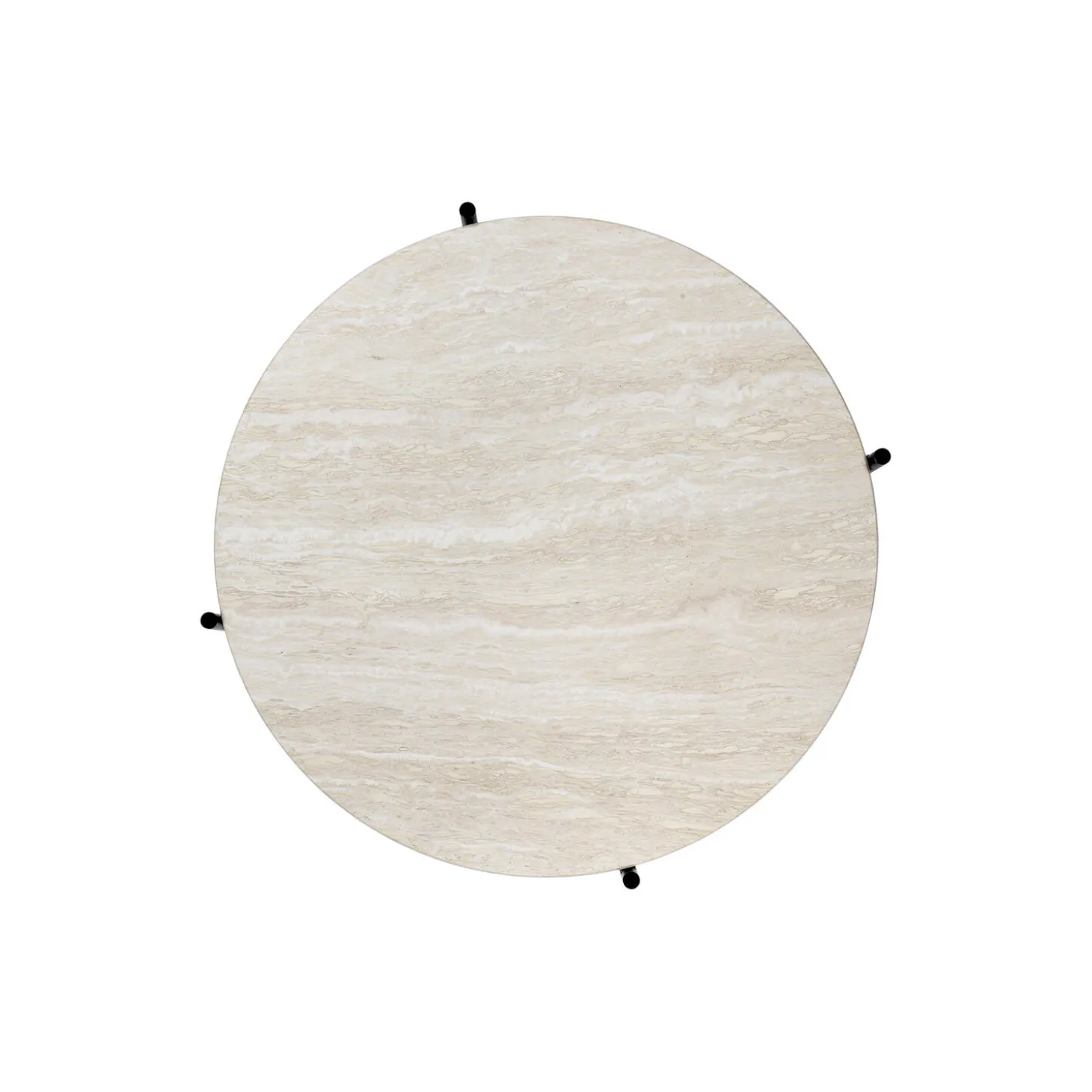 TS Outdoor Coffee Table med bordplade i outdoor travertin og stel i pulverlakeret rustfrit stål fra GUBI. Farve: neutral white. Mål: H: 35 x Ø 80 cm. Design: GamFratesi.
