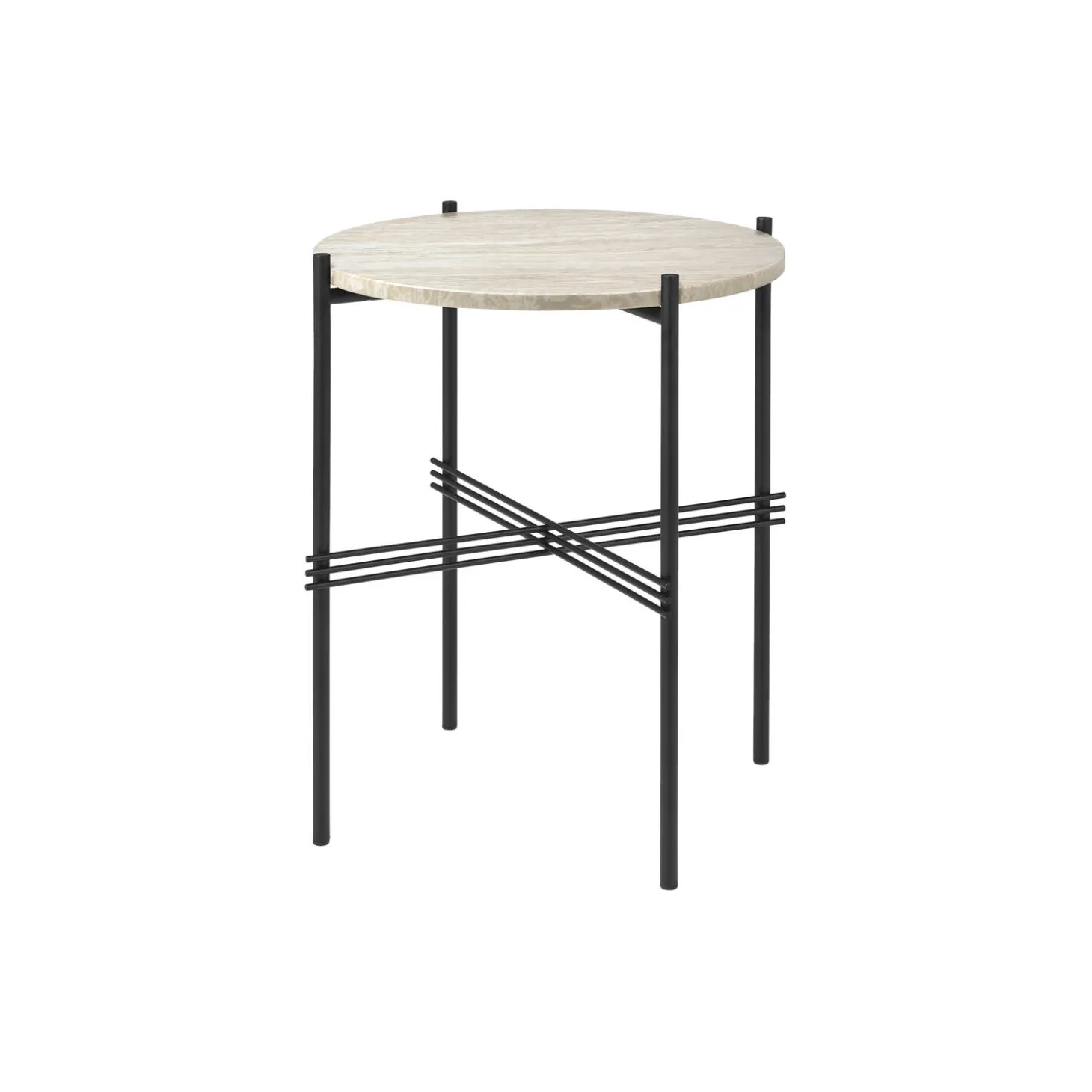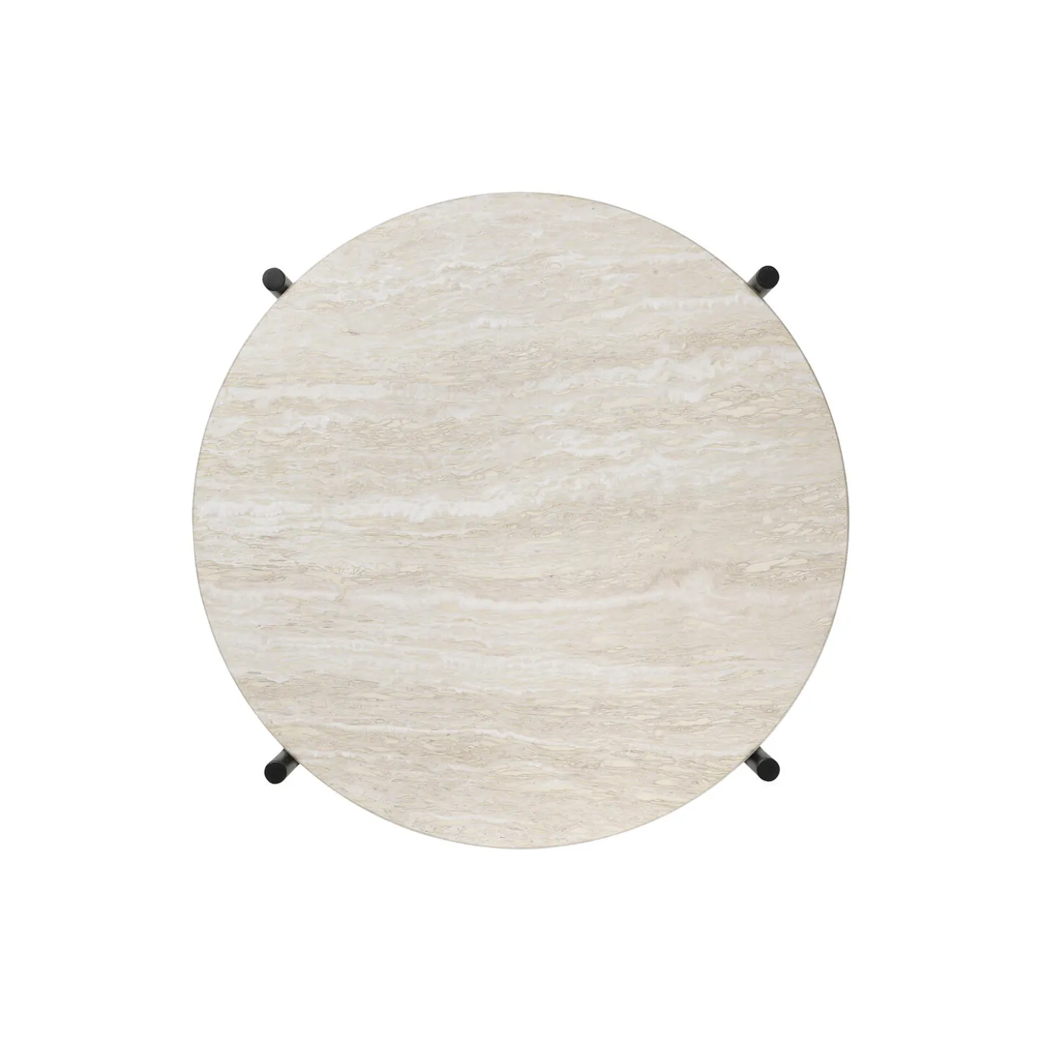 TS Outdoor Side Table med bordplade i outdoor travertin og stel i pulverlakeret rustfrit stål fra GUBI. Farve: neutral white. Mål: H: 51 x Ø 40 cm. Design: GamFratesi.