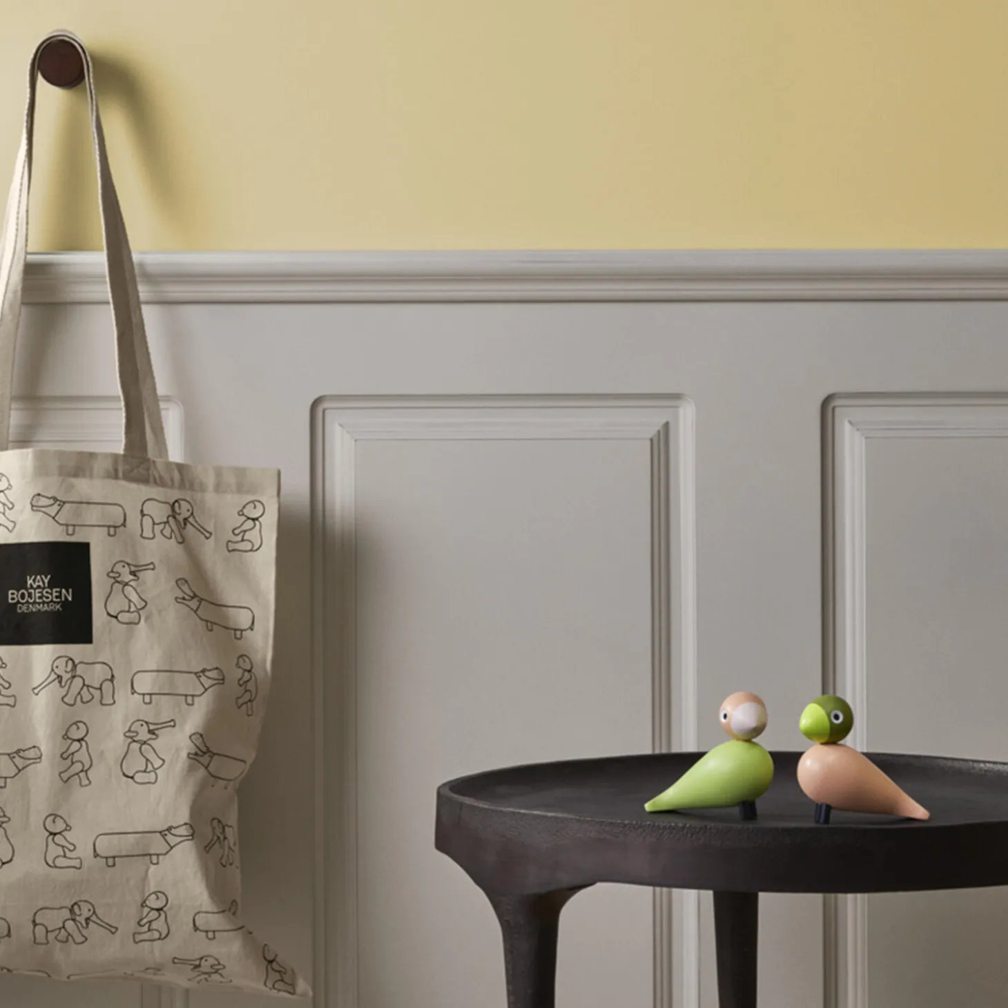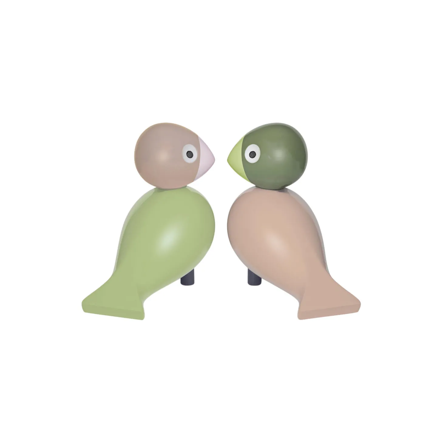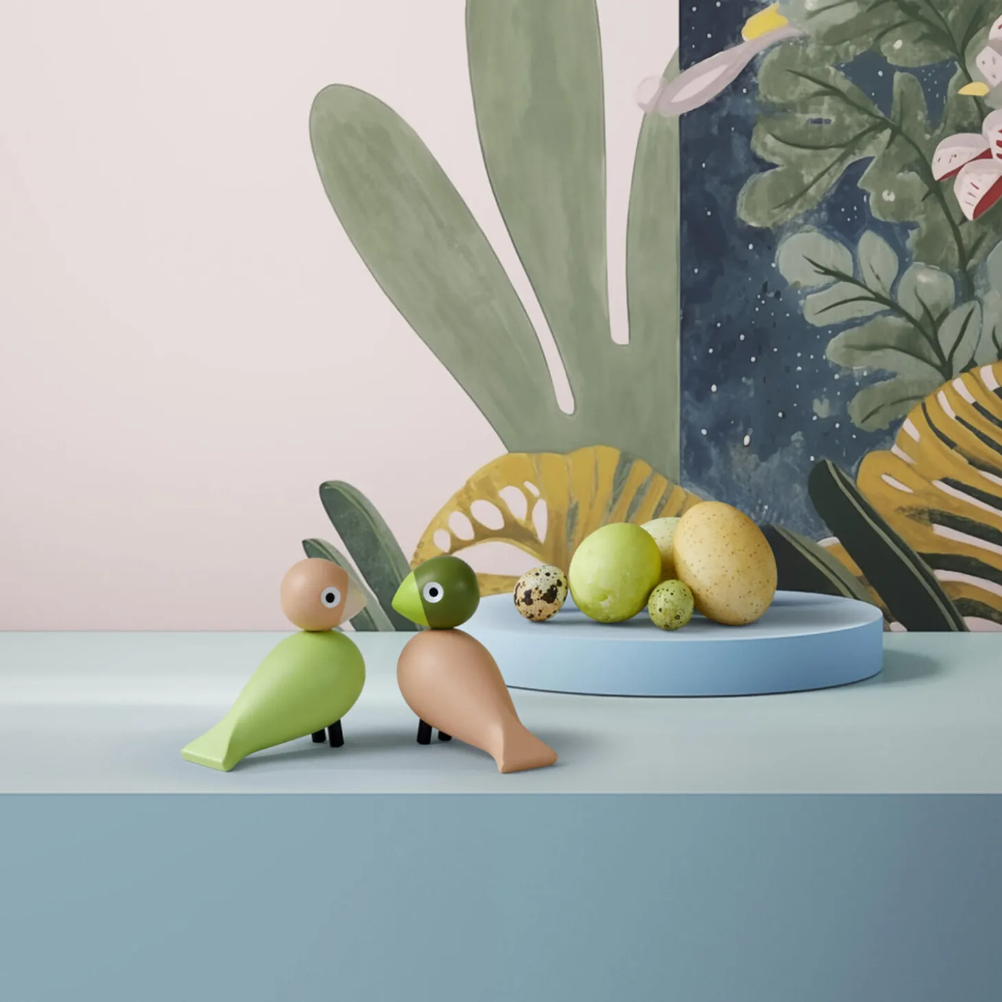 Fugle mødes og sød musik opstår. Serien af sangfugle og turtelduer er elskede klassikere i dansk design og evige symboler på tidløs kærlighed. Og med dette både moderne og klassiske turtelduepar får du to unikke fugle i det ikoniske Kay Bojesen-formsprog, der med deres harmoniske farver og charmerende udtryk omfavner ansvarlighed og folder vingerne ud med masser af liv og sjæl – og lander lige i hjertet hos både store og små. Den ene turteldue har lysegrøn fjerpragt, rosa næb, sandfarvet hoved og lyseblå ben, mens den anden prydes af en rosa fjerpragt, lysegrønt næb, grønt hoved og sandfarvede ben – stort set samme farvepalet for begge turtelduer. Begge turtelduer måler 9 cm i højden og er fremstillet med stor præcision i FSC®-certificeret bøgetræ, der garanterer, at træet til produktionen er plantet, dyrket og fældet ansvarligt. De farvede turtelduer er inspireret af tidens farvetrends og emmer af et ægte vidnesbyrd om kærligheden til originalt dansk design og fascinationen af de klassiske træfigurers skønhed. Samtidig markerer de en unik samhørighed, et samlende fællesskab i en nogle gange lidt for fragmenteret verden. Fuglene ved du, hvor du har. Og de har hinanden. Med simple grafiske virkemidler er de ikoniske sangfugle i årevis blevet bragt til live i et væld af farver – alle i Kay Bojesens helstøbte design med det velbalancerede udtryk, der fremstår indbydende, roligt og rart. Nyd dem derhjemme, sammen eller hver for sig. Eller giv den ene eller dem begge til en, du har kær. Uanset hvordan du udfolder Kay Bojesens originale fortællinger i træ, så har turtelduerne en helt særlig appel til både børn og voksne og er en god gaveide til dåb, fødselsdag, studentergave, jubilæum eller bryllup. En klassiker, der flyver med dig gennem hele livet – lige fra børneværelset til at blive et elsket designikon i egen bolig.