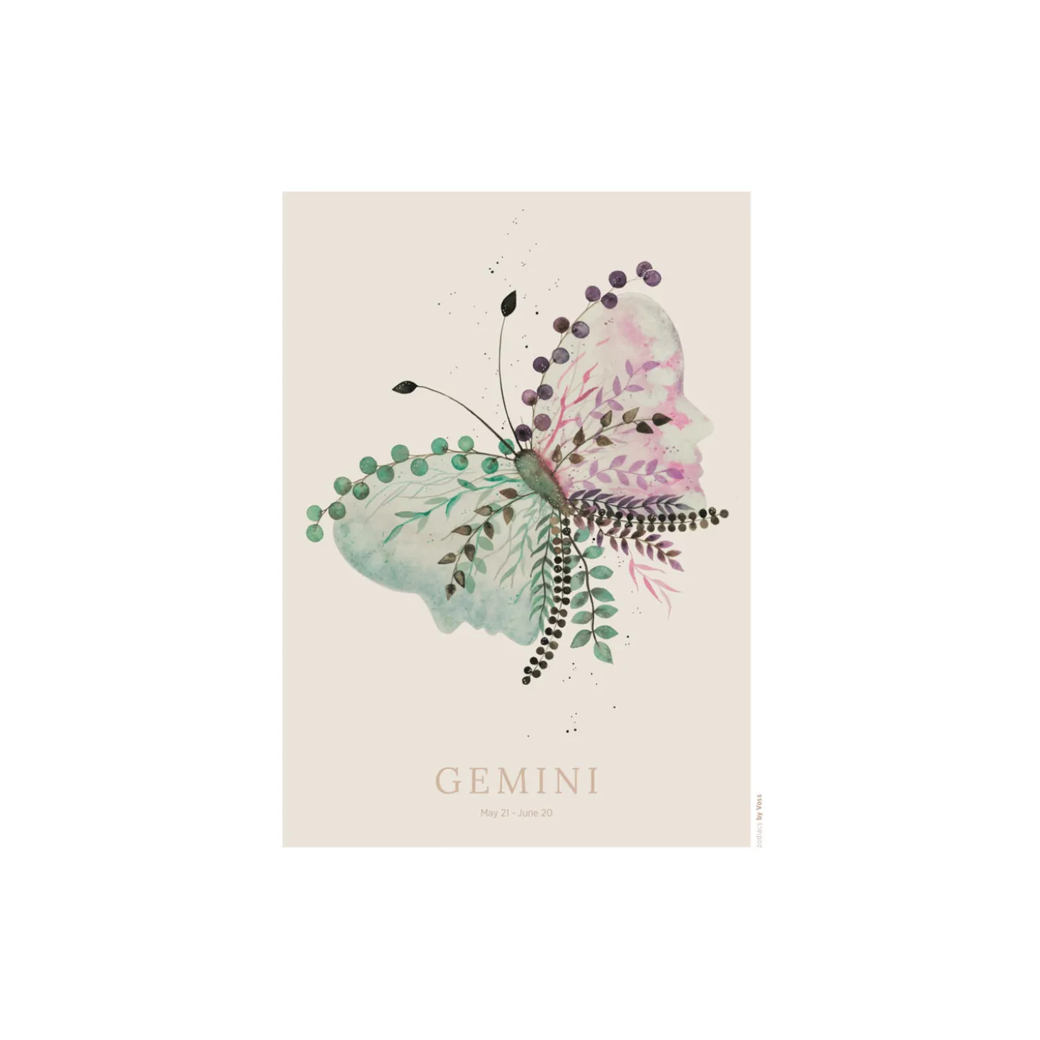 Tvillingen plakat fra All by Voss. Plakatdesign med grafik (tekst) og beige flade under motiv, med trykt hvidt passepartout. Originalen er scannet i høj opløsning for bedst muligt gengivelse. Produceret i Danmark.