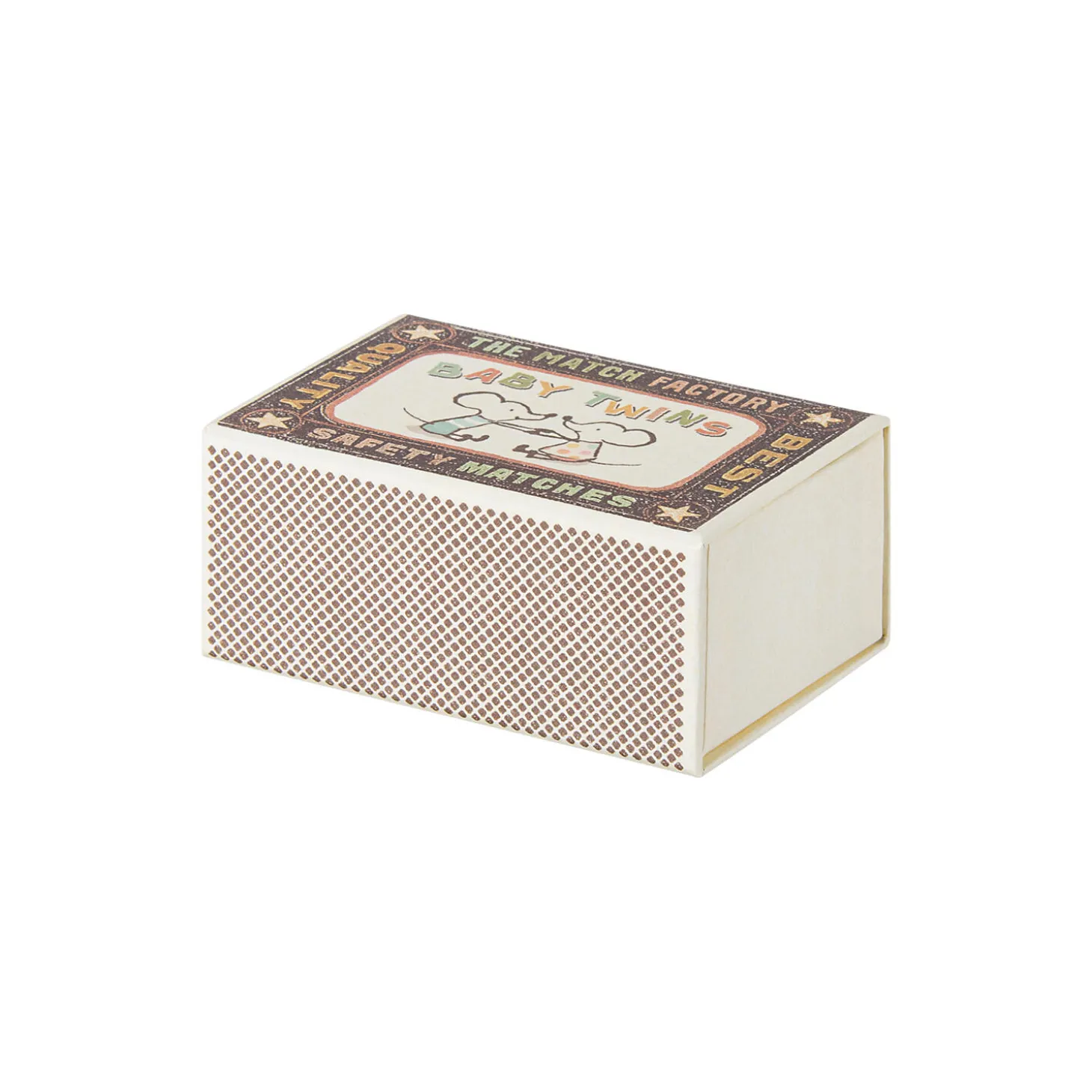 En klassisk Maileg-vare. Disse baby tvillingemus sover trygt i deres sovepose side om side i tændstikæsken. Disse mus passer til alt tilbehør i størrelse babymus. Stoffet kan variere.