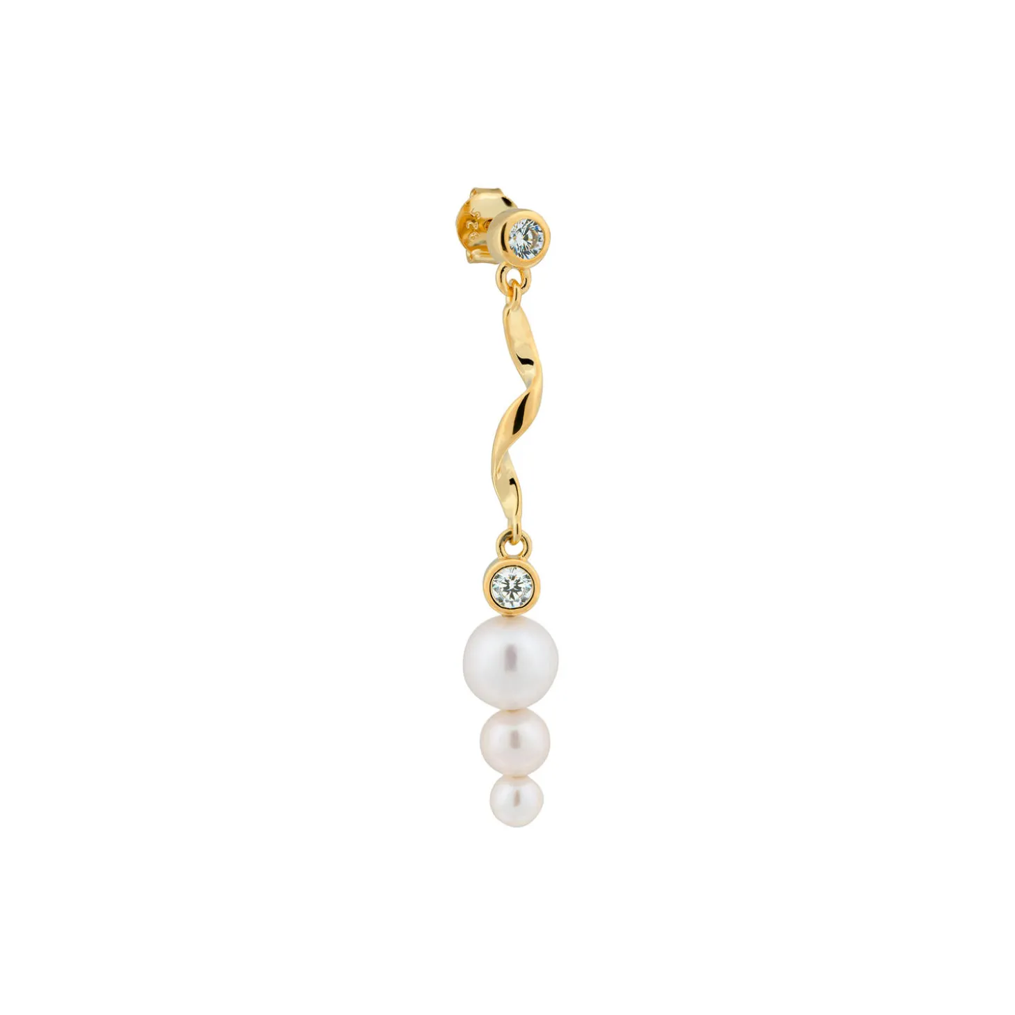 Smuk ørering i snoet design med hvide ferskvandsperler og klare sten. Sælges enkeltvis.
