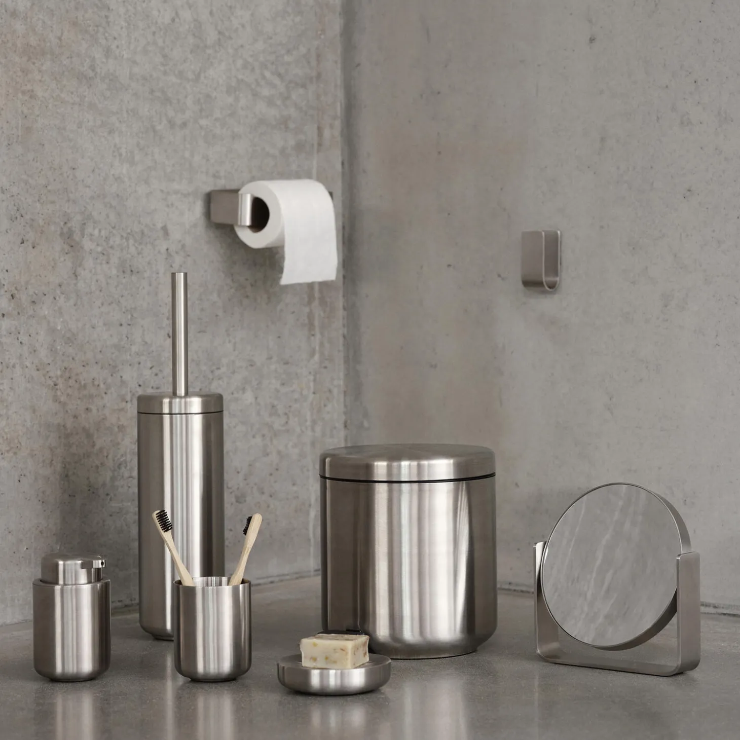 UME-serien har i flere år været et centralt ikon i Zones badkollektion. Nu udkommer serien i et eksklusivt nyt materiale, nemlig mat stål. Et oplagt valg til badeværelser og toiletter alle steder, hvor funktion og æstetik er i højsædet. De bløde organiske former får smukt modspil fra det stilrene og kølige stål i serien, som er skabt i samarbejde med designteamet VE2. I gulvhøjde byder serien på en mindre pedelspand samt toiletbørste i cylinderformet holder. Til væggen er der matchende toiletrulleholder samt kroge i elegant u-form med skjulte beslag. Til bordet findes både sæbedispenser, sæbeskål samt tandbørstekrus samt rundt bordspejl med vippefunktion. På trods af stålets mathed reflekterer lyset sig smukt i overfladen og giver overfladen liv og karaktér. Alt i alt en formfuldendt forvandling af en ægte Zone-klassiker.