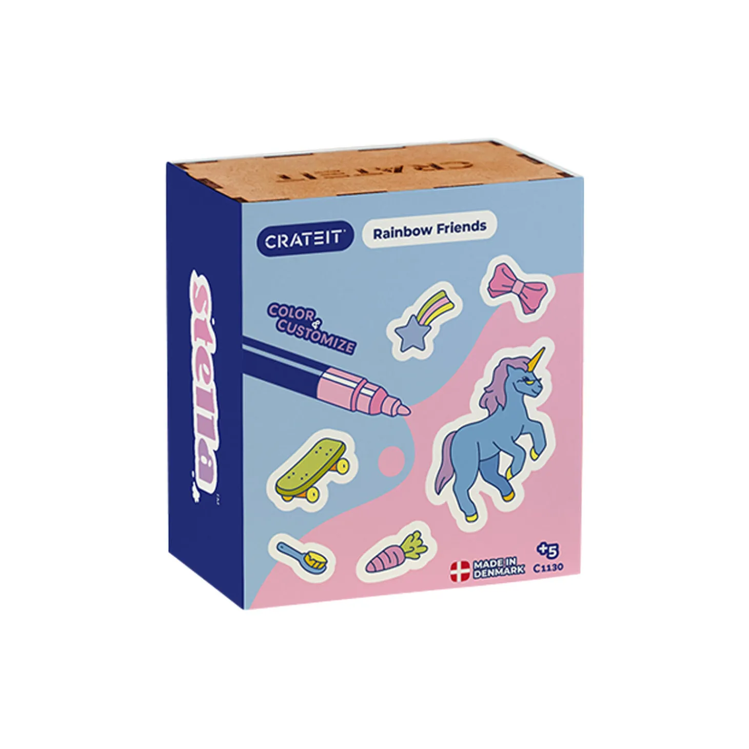 Farverige regnbuer og stjerneklare nætter. De fem regnbuevenner er altid på jagt efter nye eventyr – både flyvende gennem luften, og med fuld fart på skateboard. Hop med på rejsen og skab universet omkring de fem magiske karakterer. Specifikationer Produceret i DanmarkAntal figurer/dele: 18 figurer Varenummer: C1130 Størrelse på pakken: 10.5x12x6.5cm Figurerne er ca. 7-10 cm. høje Vægt: 230gr. Alle vores produkter er produceret i træ uden farve. Det skal du påføre selv.Kan farvelægges med alle slags tuscher, maling og farveblyanter.Tuscher følger ikke med og kan købes ved siden af.