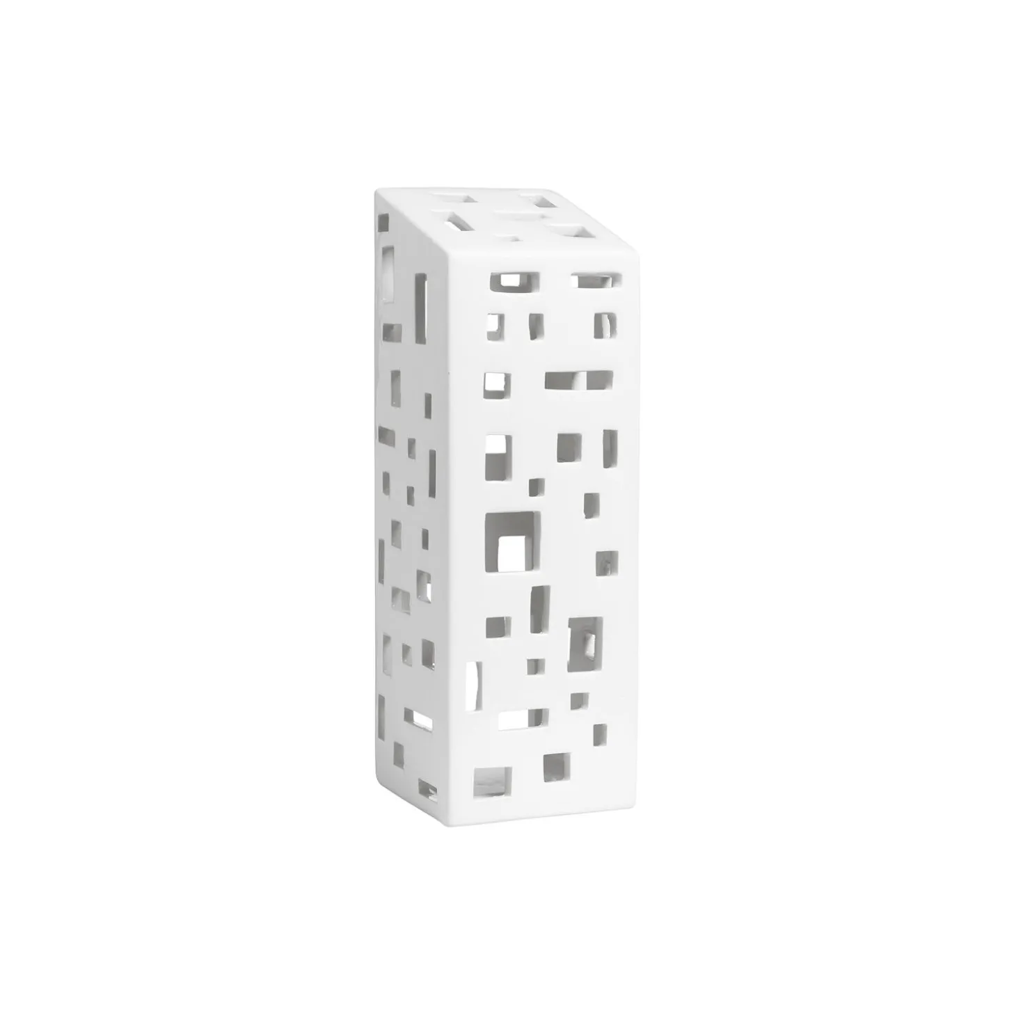 Urbania-lyshuset er et billede på et modernistisk højhus, der med sine små håndskårne vinduer spreder mageløse silhuetter og dragende skygger. Lyshusets dybhvide glasur bliver oplyst, som et levende og poetisk billede på det mangfoldige byrum af blot et enkelt fyrfadslys. Skab en helt unik porcelænsby med Urbania-lyshusene og nyd stearinlyset skær inde som ude.