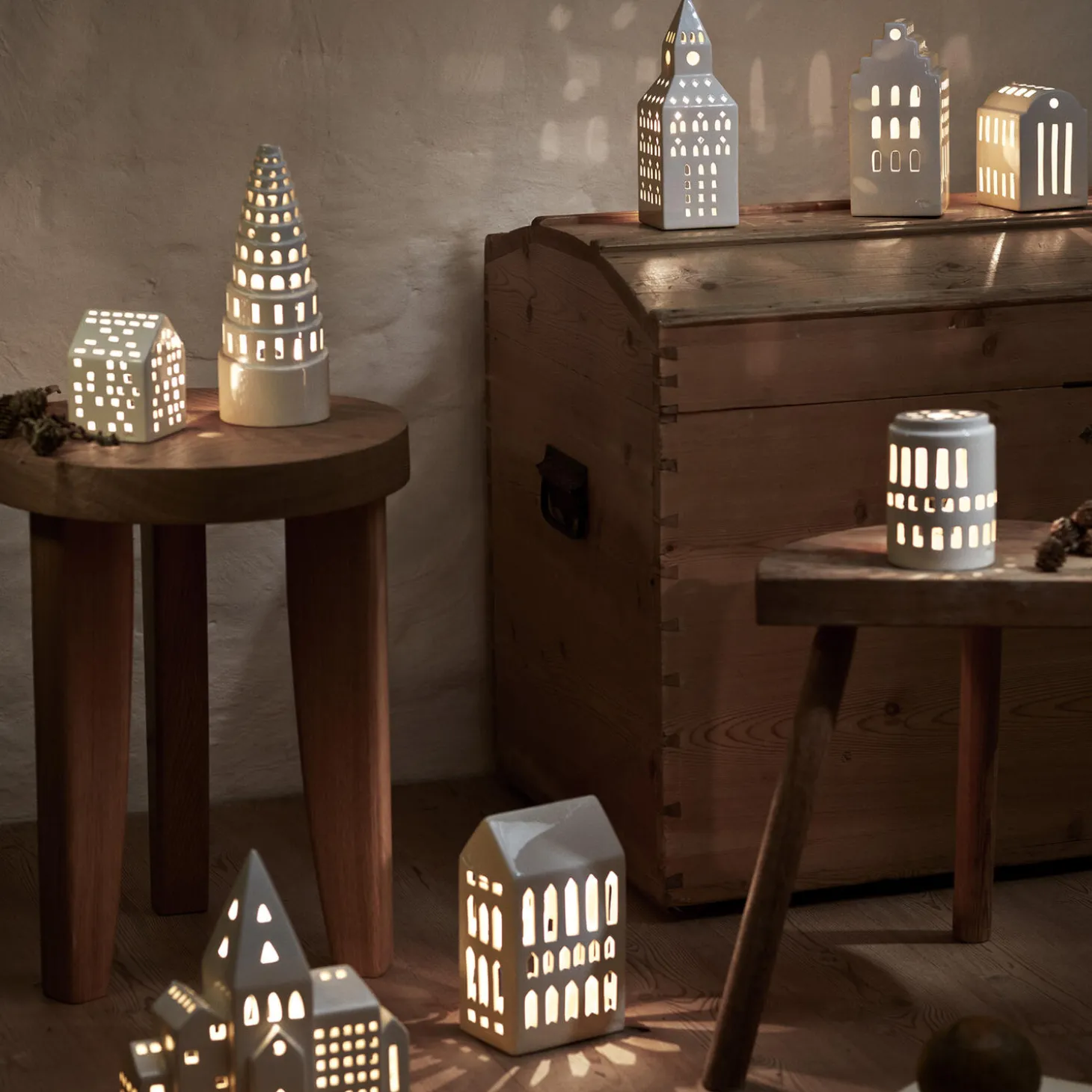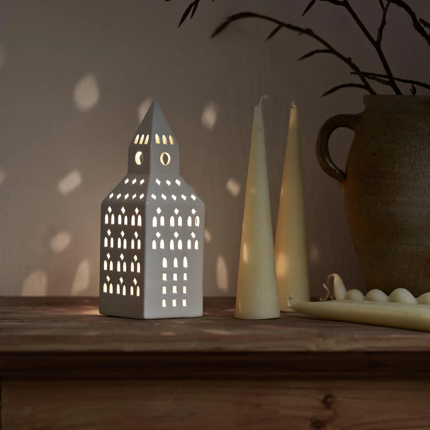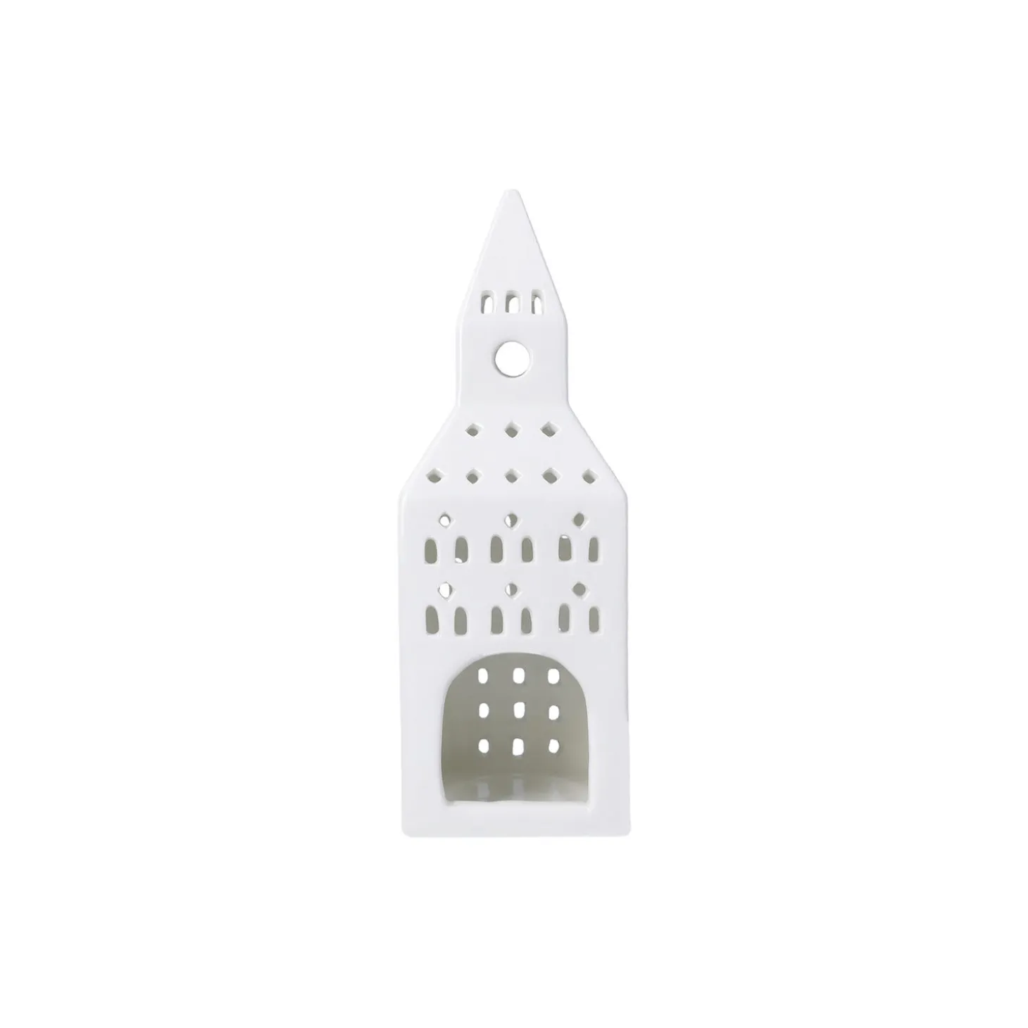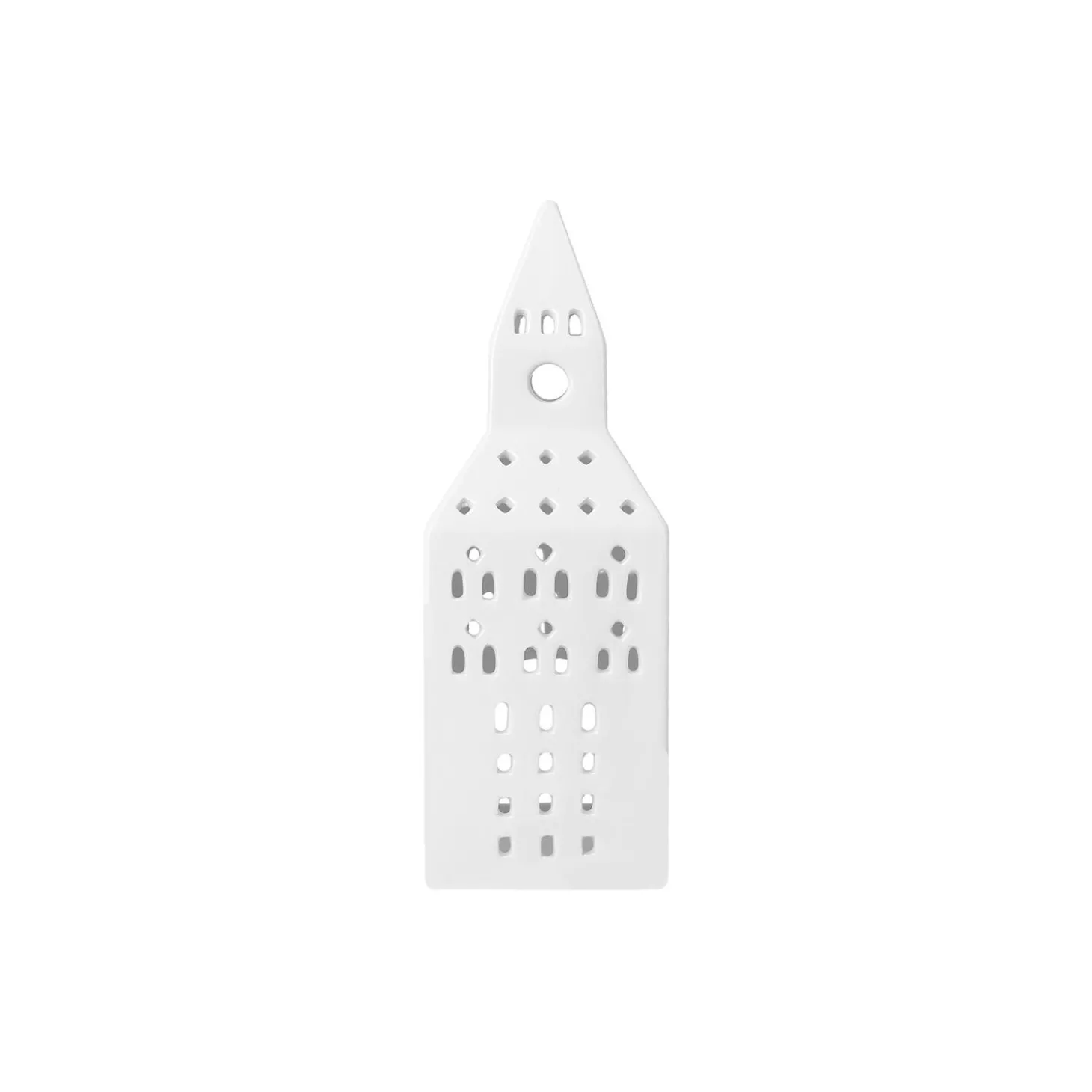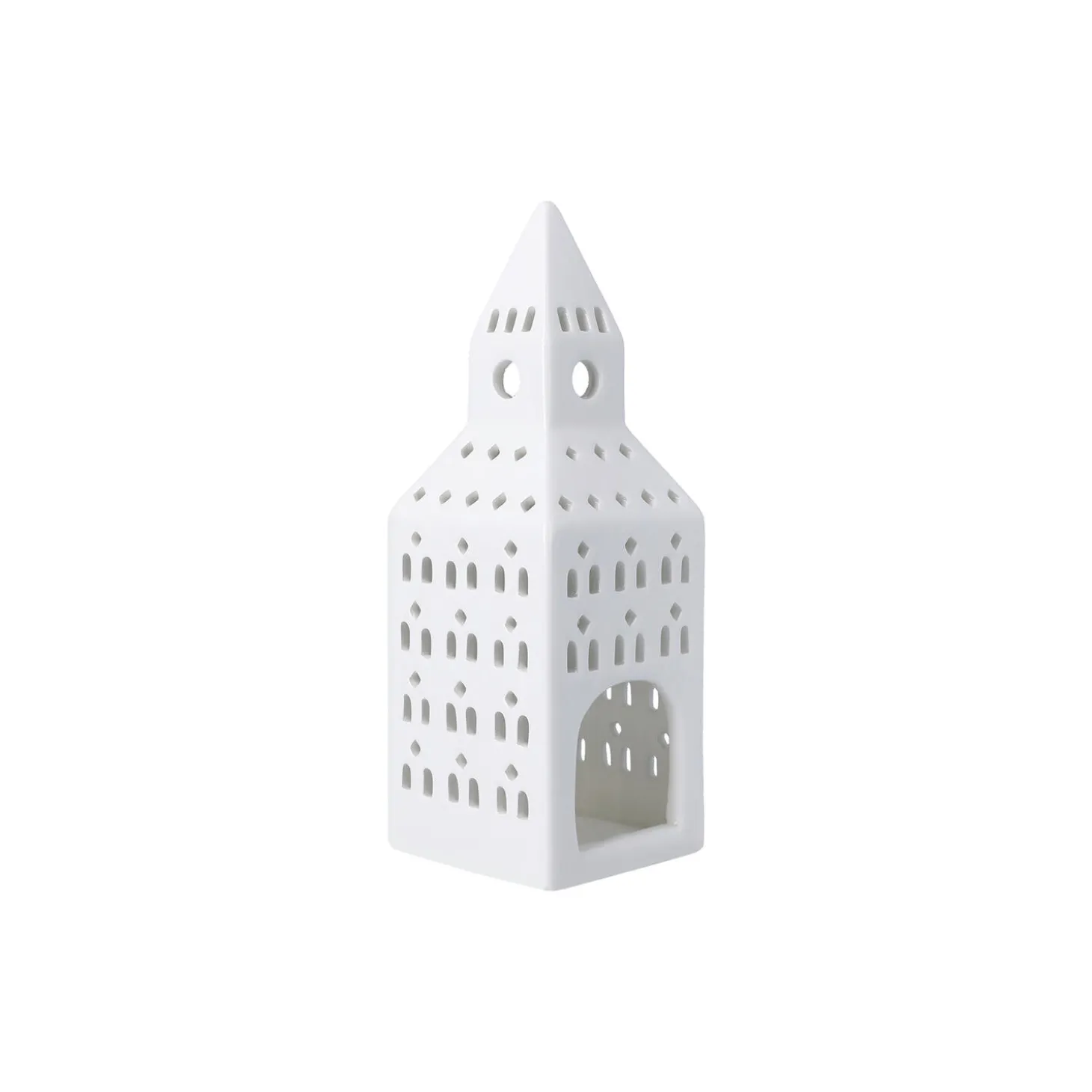 Nyd klassisk bygningskunst fortolket i blankglaseret keramik gennem Kählers håndlavede designfilosofi. Med lyshuset Urbania Kirketårn hylder Kähler lysets naturlige skønhed og den håndlavede keramiks autenticitet i et både poetisk og elegant formsprog. Kirketårn-lyshuset måler 20 cm i højden og er ligesom resten af Kählers populære Urbania-serie af ikoniske lyshuse designet af Mette Bache og Barbara Bendix Becker. Urbania Kirketårn er formet af tradition og omfavner smukt og autentisk den hyggelige atmosfære, du finder i de mange kirketårne, der ligger spredt ud over landet. Og med hvert vindue udskåret i hånden får du altid en både stilfuld og hyggelig silhuet, hvor fyrfadslysets funklende stråler bliver reflekteret i Urbania-lyshusets kridhvide keramik og danner legende klynger af lys og skygge omkring sig.