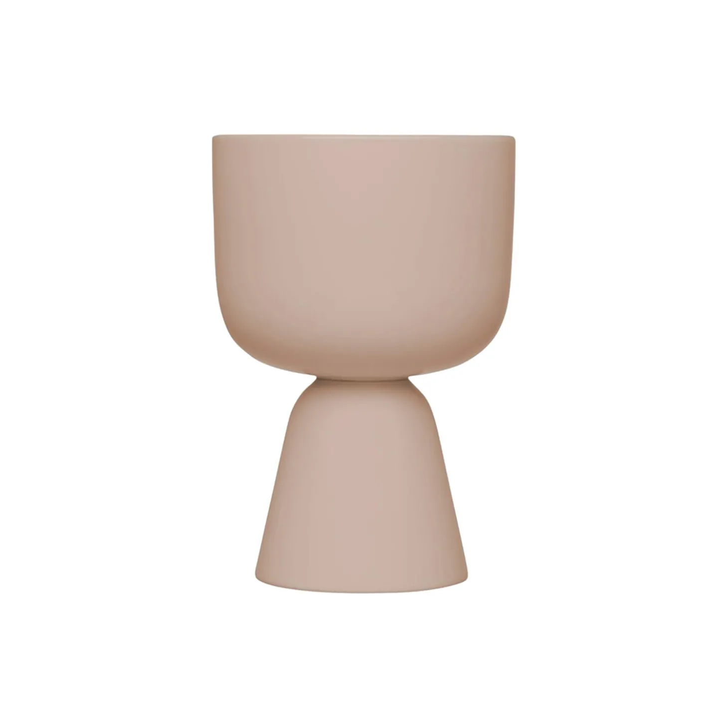 Et bords akavede form og »hævede« ben var designer Matti Klenells inspiration til Nappulas karakteristiske silhuet. Nu er Nappula-plantepotten en moderne nordisk designklassiker med et sjovt spil på den karakteristiske silhuet med sit flydende, buede design. Den mindre størrelse viser planter smukt i ethvert interiør. En sand inspiration til grønne udstillinger. Giver dig mulighed for at bringe det udendørs ind. Beige fremhæver det minimalistiske design. Slående alene eller i grupper. En perfekt gave.