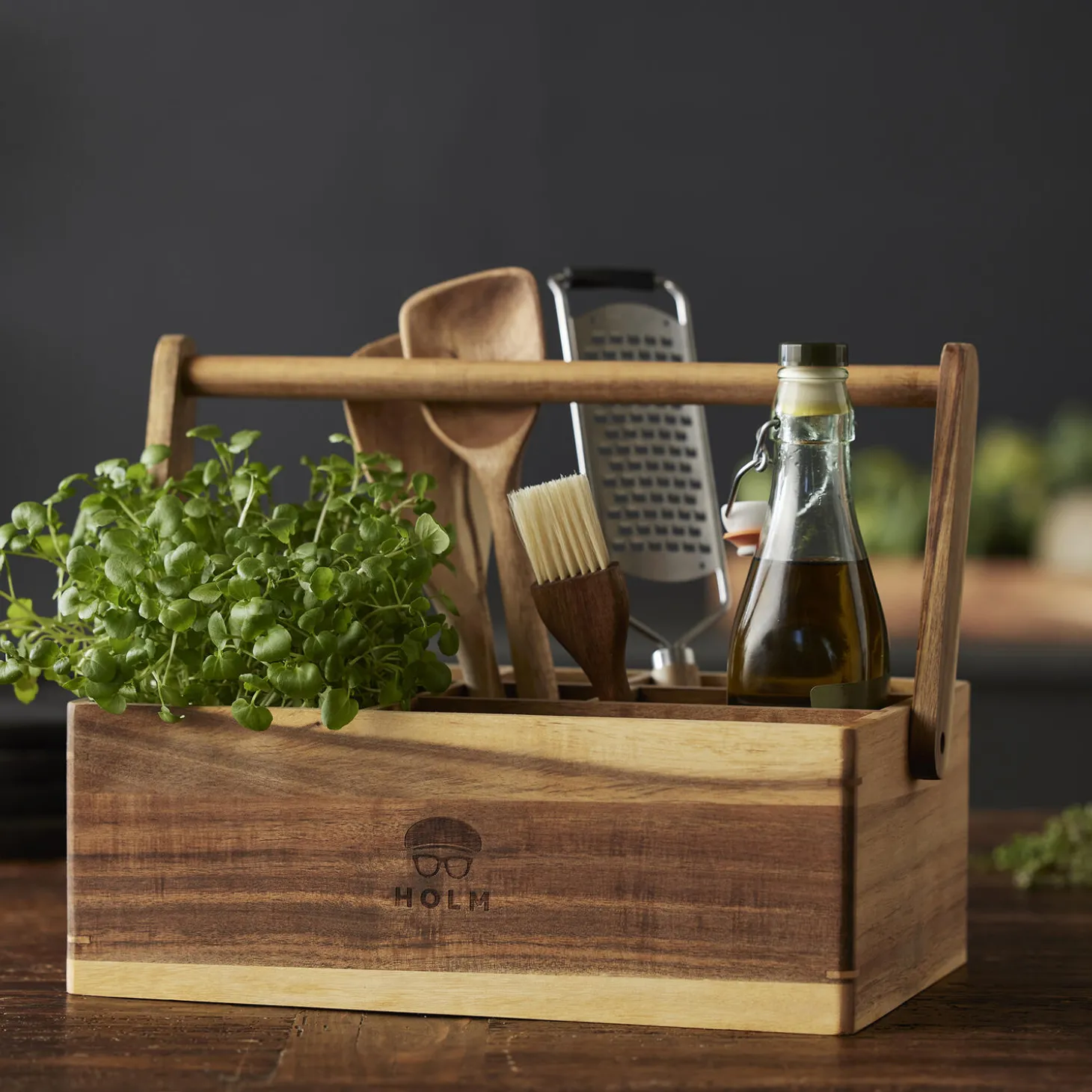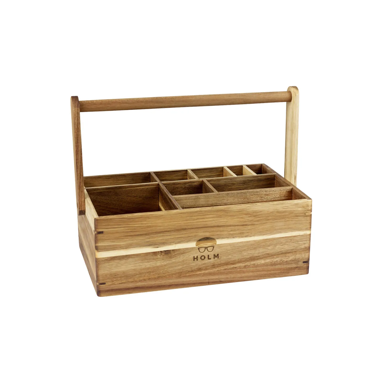 Værktøjskasse/holder med 9 rum. Lavet i akacietræ. Kan bruges til opbevaring af redskaber, salt- og peberkværne eller fyldes med andre lækre HOLM produkter. Sættes aldrig i blød.Varen er produceret i FSC®-certificeret akacietræ (FSC-C166612).