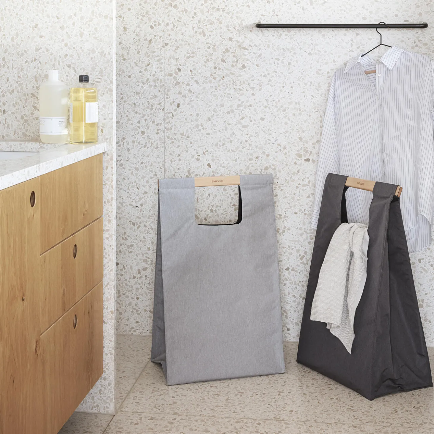 Gem vasketøjet af vejen i et snuptag med funktionel vasketøjskurv, opbevaring og transporttaske i én. Den dekorative vasketøjspose i delikat grå farve har en praktisk bærehank i bøgetræ, så posen nemt kan tages med, for eksempel i vaskekælderen, lukkes nemt med magnet og står stabilt uden at falde sammen. Nem at rengøre. Aftør blot nylonforet med en opvredet klud og vedligehold håndtag i bøg med jævnlig oliering.
