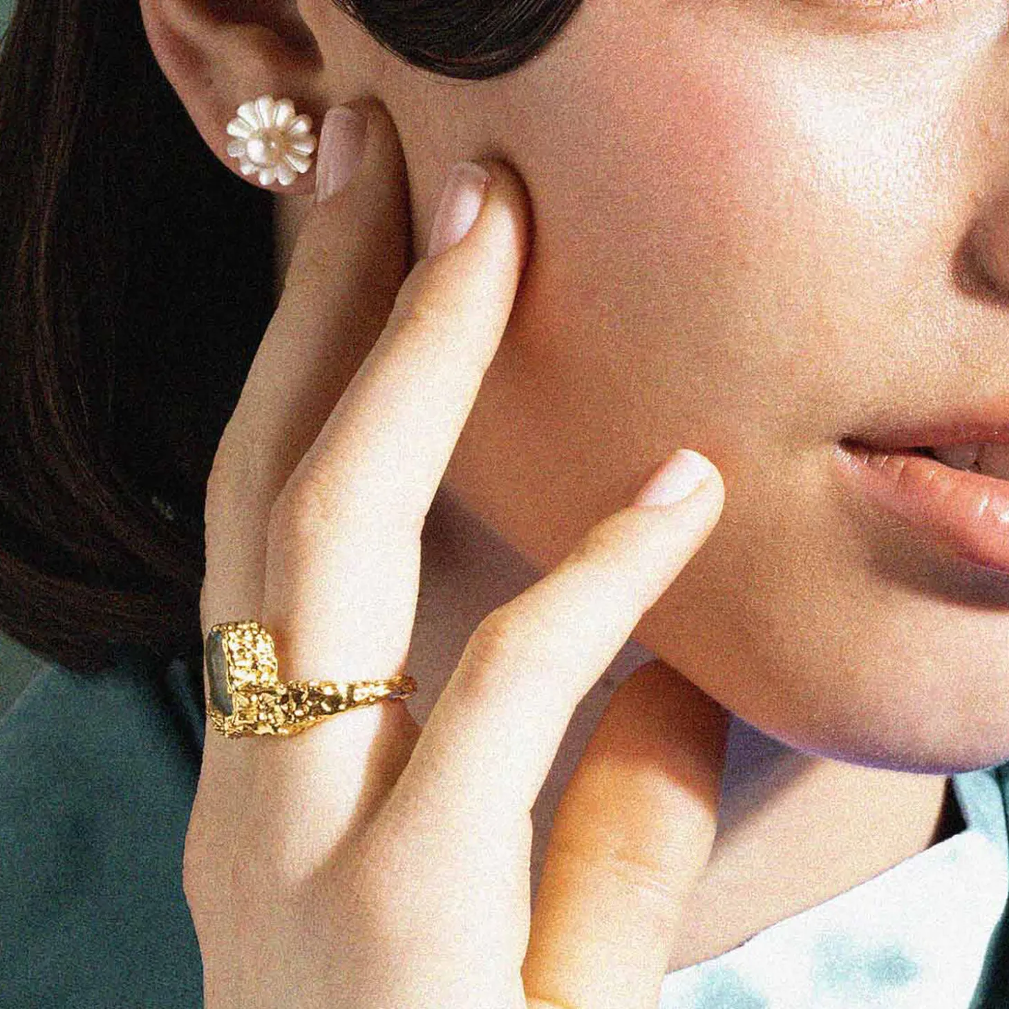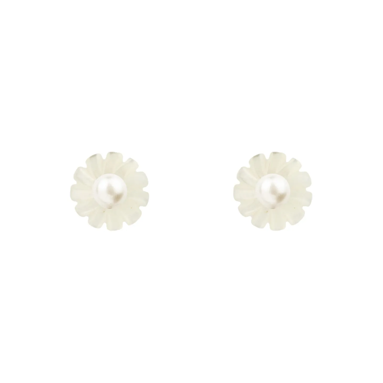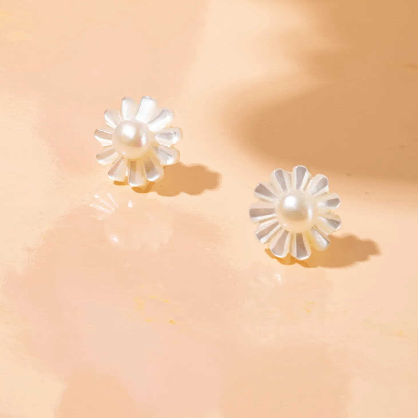 Ikonisk perlemor og elegante ferskvandsperler danner fundamentet for denne ørering, der i al sin enkelheld manifesterer sig som en perlehvid blomst, der changerer i lyset.