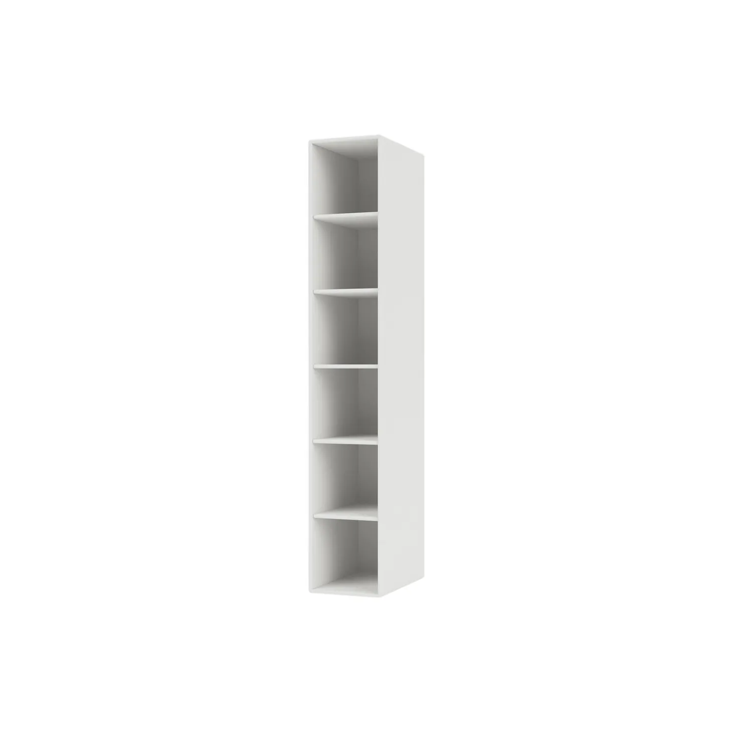 Den sidehængte reol med fem hylder fra Montana Hall serien er en lille smal reol, idéel som opbevaringsmøbel til den lille entré. Reolen er med ophængsbeslag på højre side og kan fås med eller uden figurspejl.