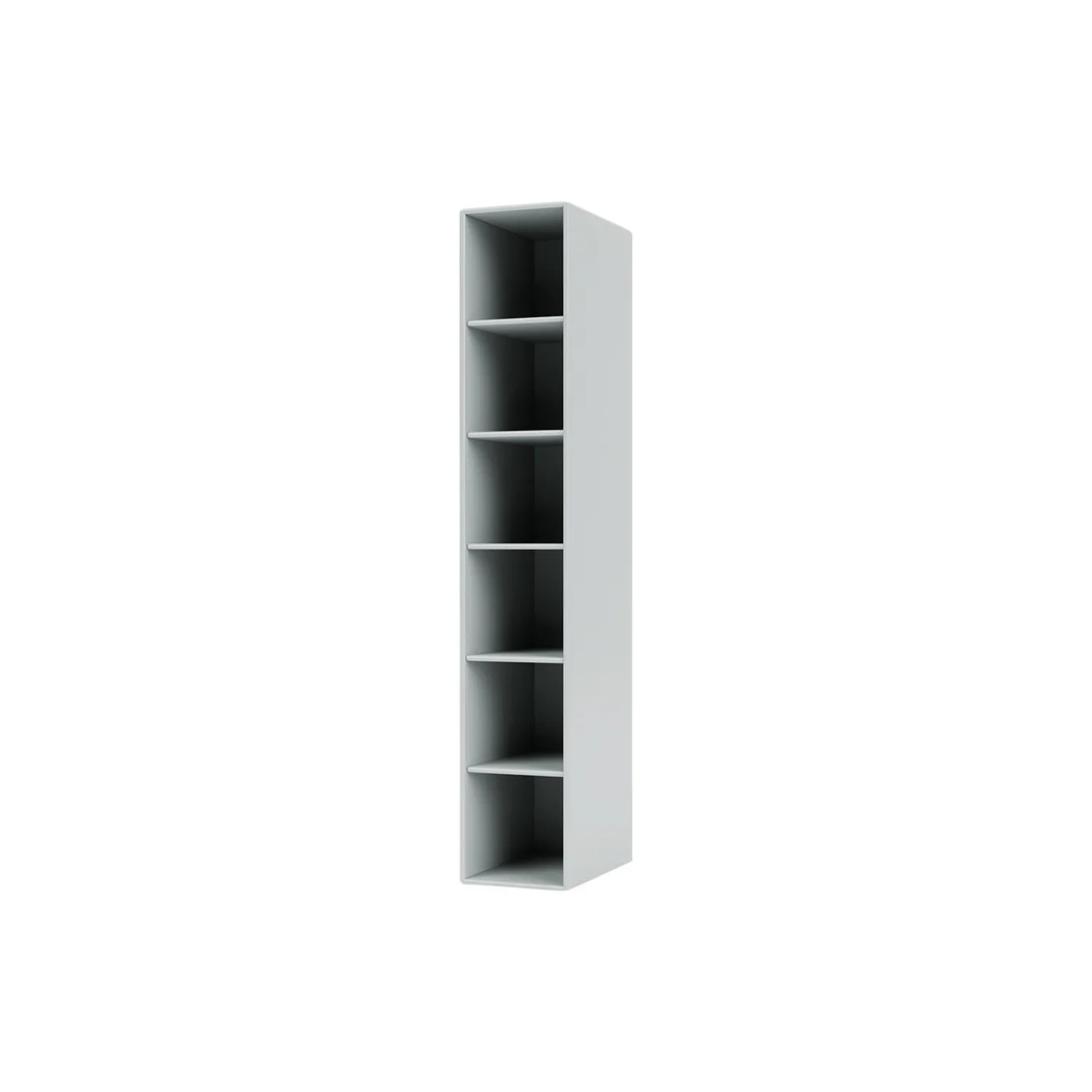 Den sidehængte reol med fem hylder fra Montana Hall serien er en lille smal reol, idéel som opbevaringsmøbel til den lille entré. Reolen er med ophængsbeslag på højre side og kan fås med eller uden figurspejl.
