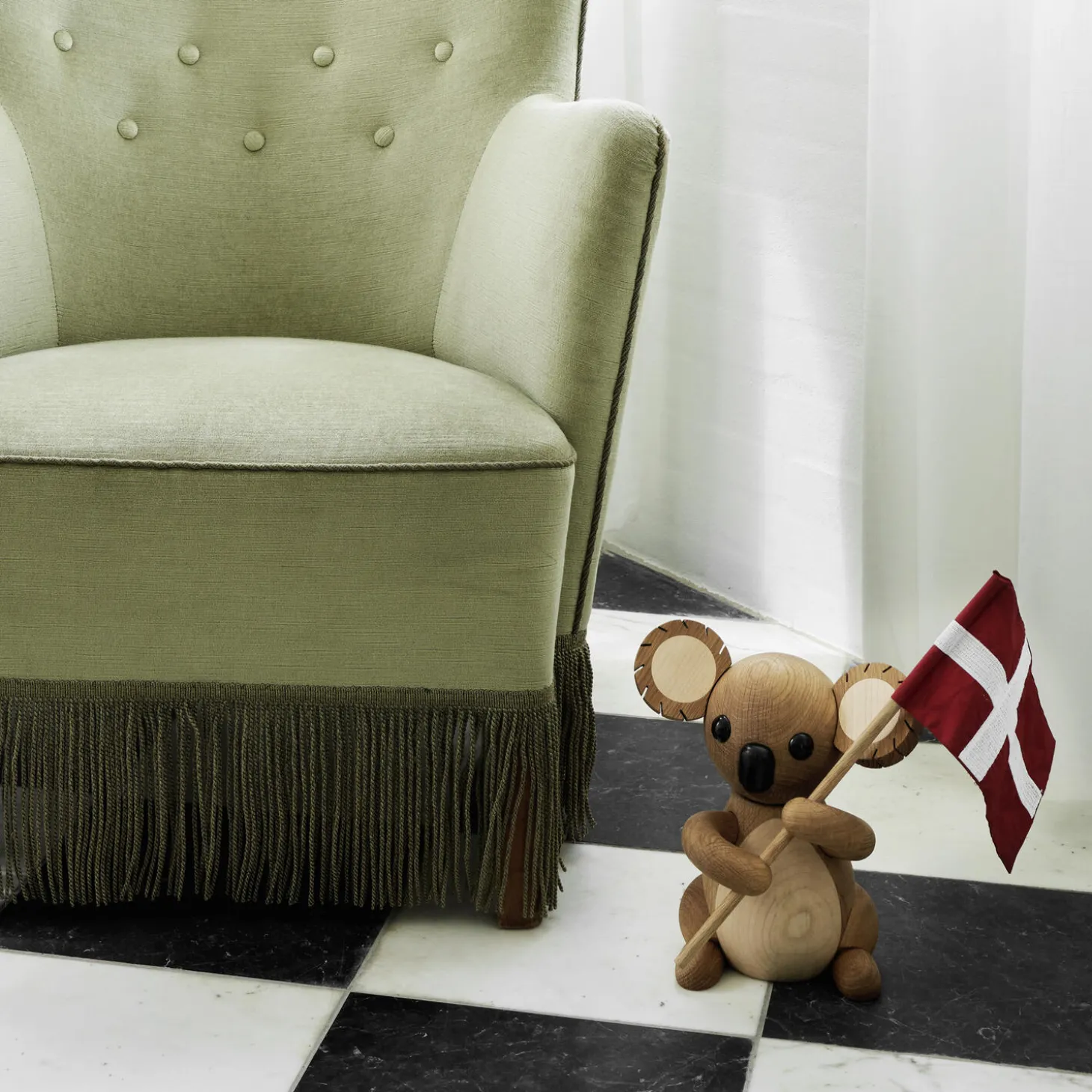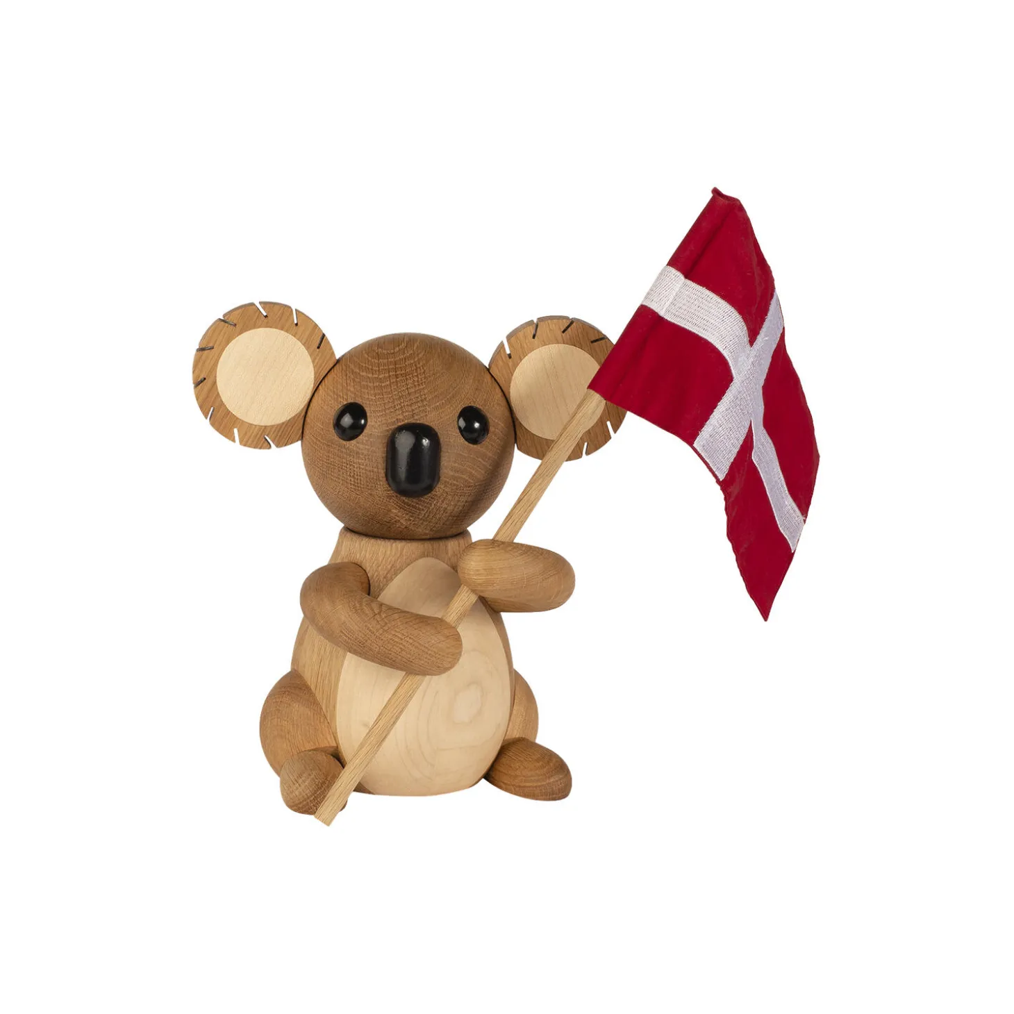 Med Victoria har Chresten Sommer skabt en sød koalafigur i stor størrelse. Arme, ører og hoved kan bevæges, så hun får præcis det udtryk, du ønsker. Der følger et dannebrogsflag med til Victoria, som hun kan holde i sin favn. Så er hun med til at gøre fødselsdage og andre mærkedage ekstra hyggelige.