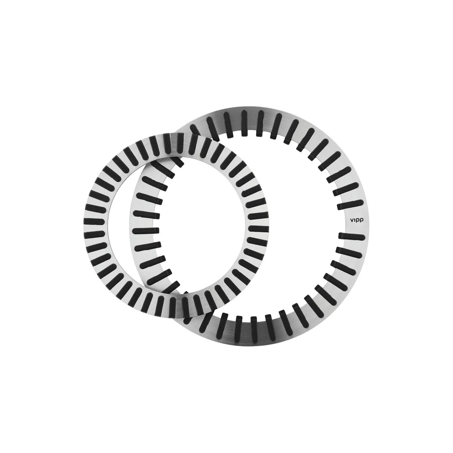 Vipp bordskånersættet består af en lille og en stor bordskåner, der passer ind i hinanden. Forhøjningerne i den laserskårne stål er fremstillet med varmeresistent silikone. Vipp bordskånersættet kan gå i opvaskemaskinen.