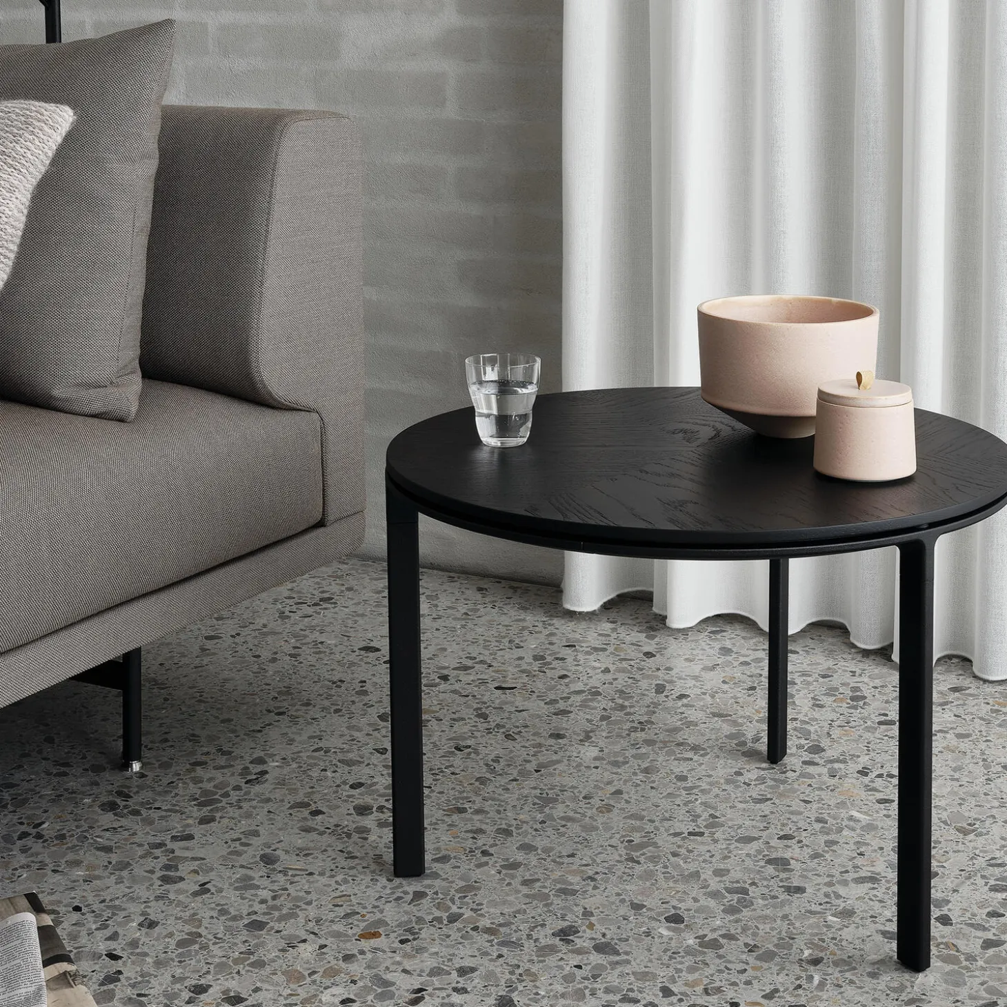 The Vipp coffee table is a versatile table for the living room. This table features a three-legged frame of black powder-coated aluminium and a tabletop of either polished marble or dark oak.