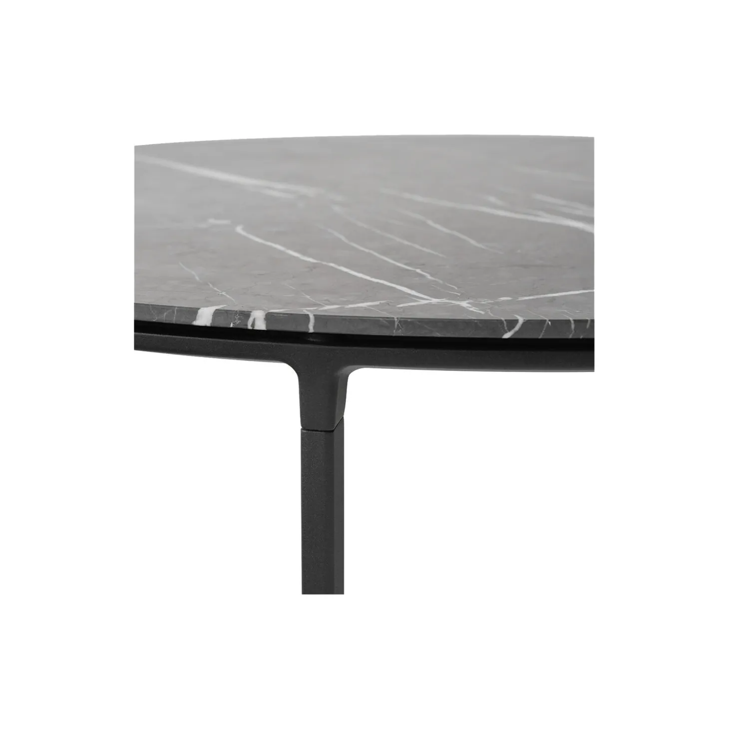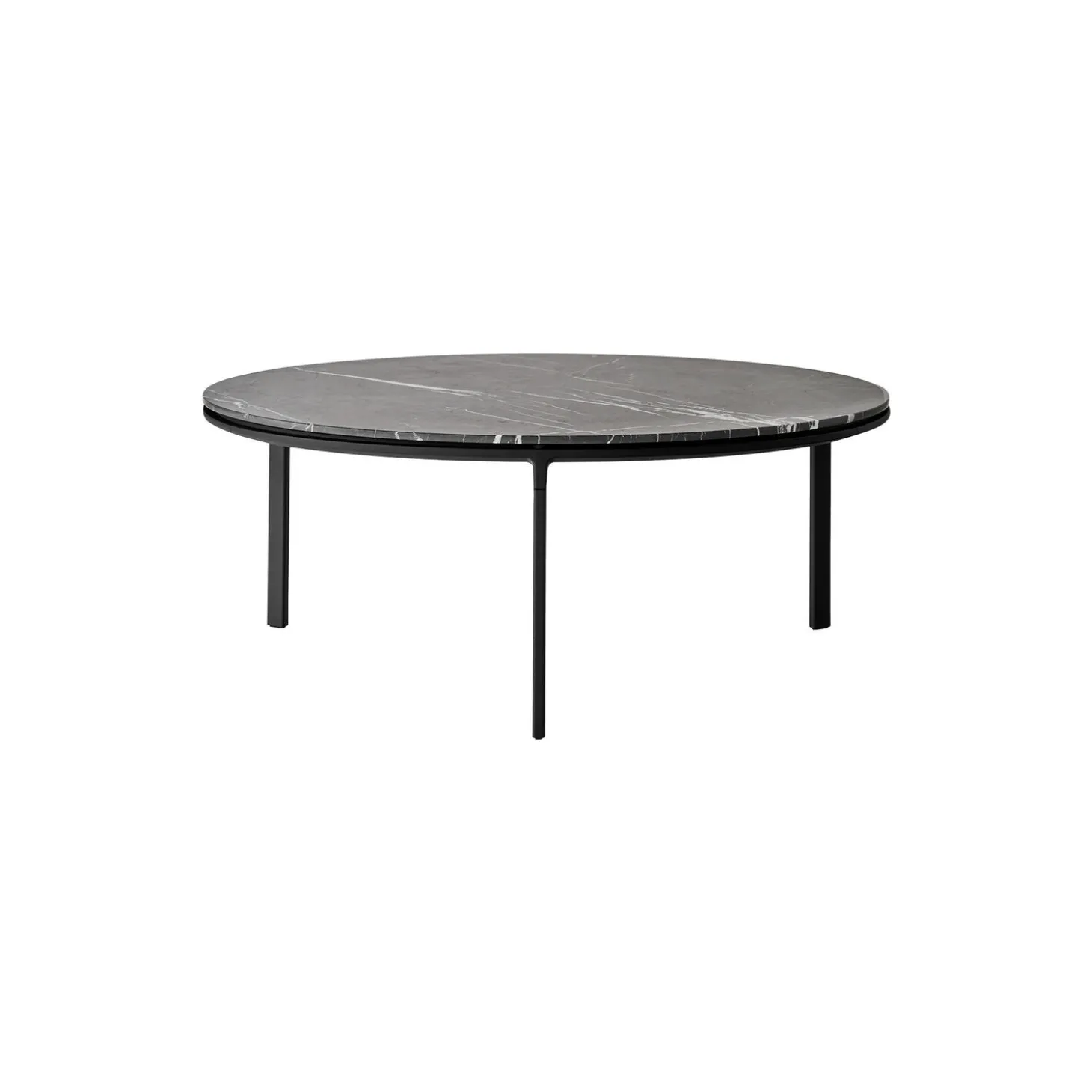 The Vipp coffee table is a versatile table for the living room. This table features a three-legged frame of black powder-coated aluminium and a tabletop of either polished marble or dark oak.