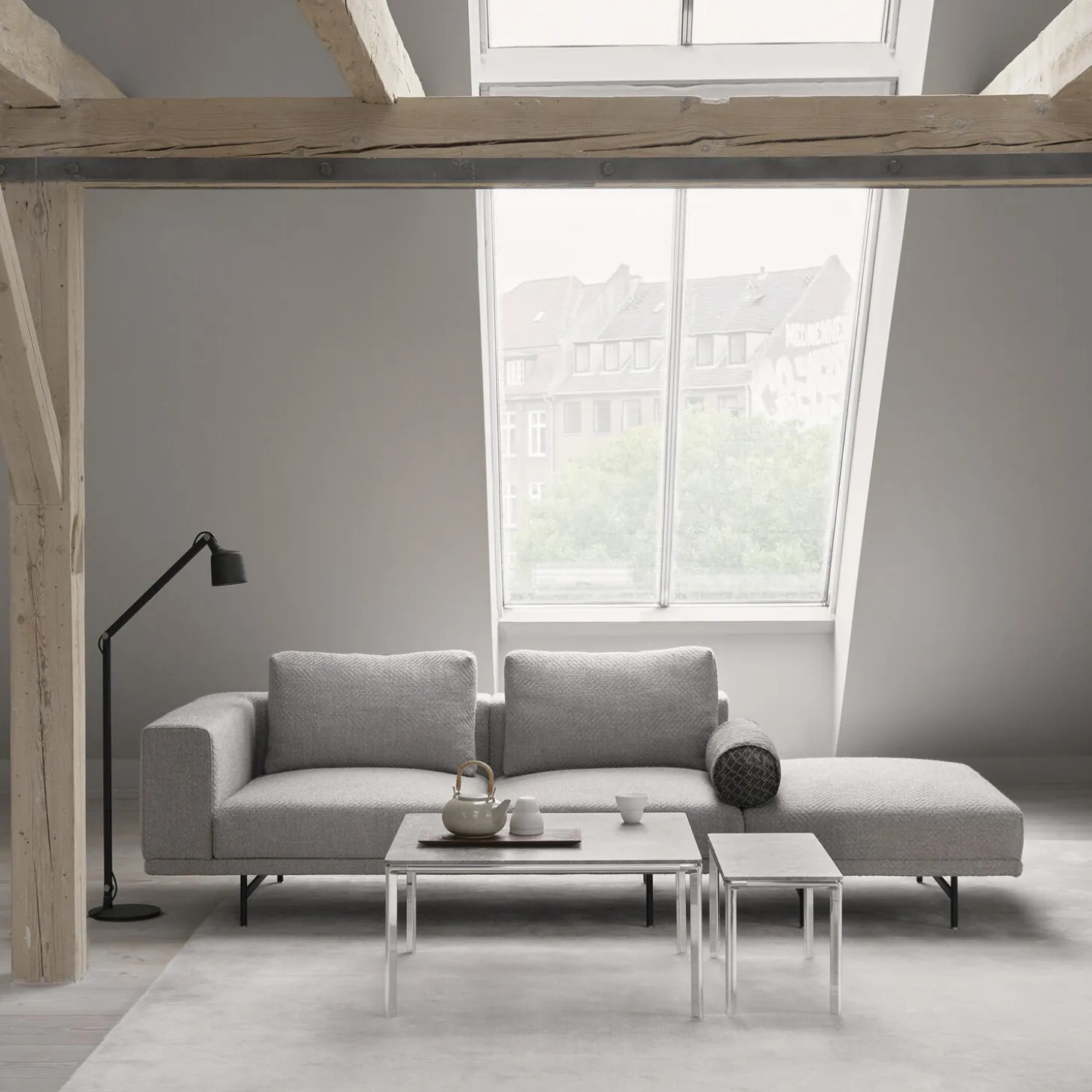 The coffee tables feature a four-legged frame of polished aluminium and a hovering tabletop of marble. Available in two sizes and with two different marble variants, the mix of organic stoneware contrasts the hardiness of the frame.The coffee tables can be displayed in solitary or paired for a complete coffee table composition. Use the smaller coffee table as a side table for either the Vipp610 Loft sofa or the Vipp632 Chimney sofa.