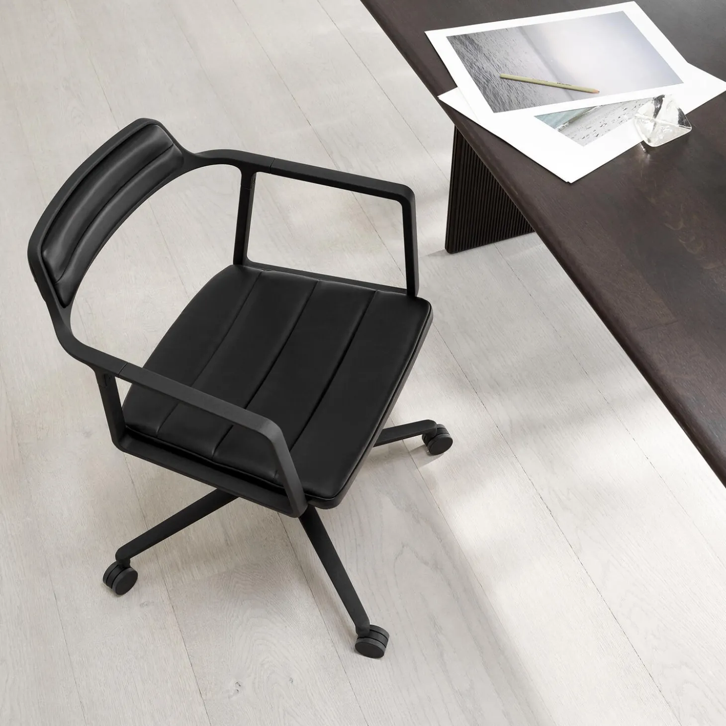 Vipp Swivel chair is suitable for the home office or meeting room. The chair features a polished or powder-coated aluminium frame with an upholstered leather seat and backrest. A four-legged base on castor wheels allows for a 360° seat rotation. Also available with gliders. The upholstery of black, sand or green leather features unique visual characteristics.