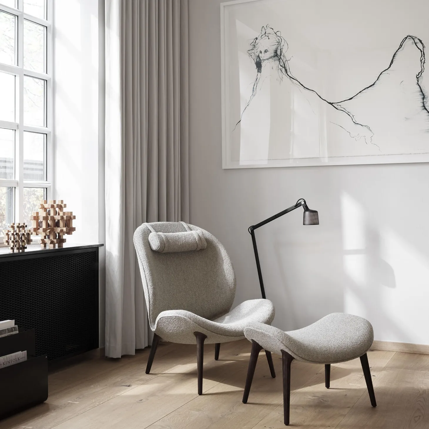 Lodge lenestolen er egnet til stuen. Denne lenestol har en polstret skal og ben af egetræ. Skallen kan polstres i hele Vipps polsterkollektion.