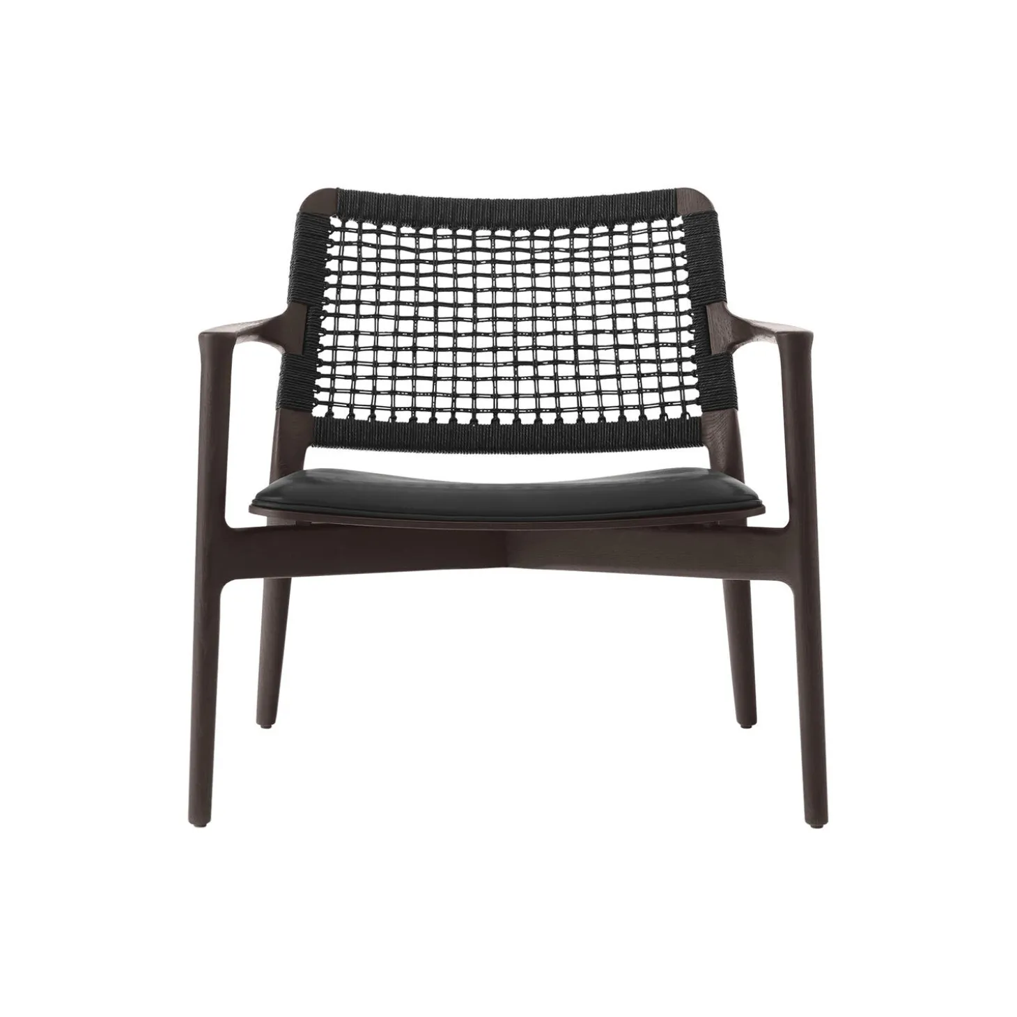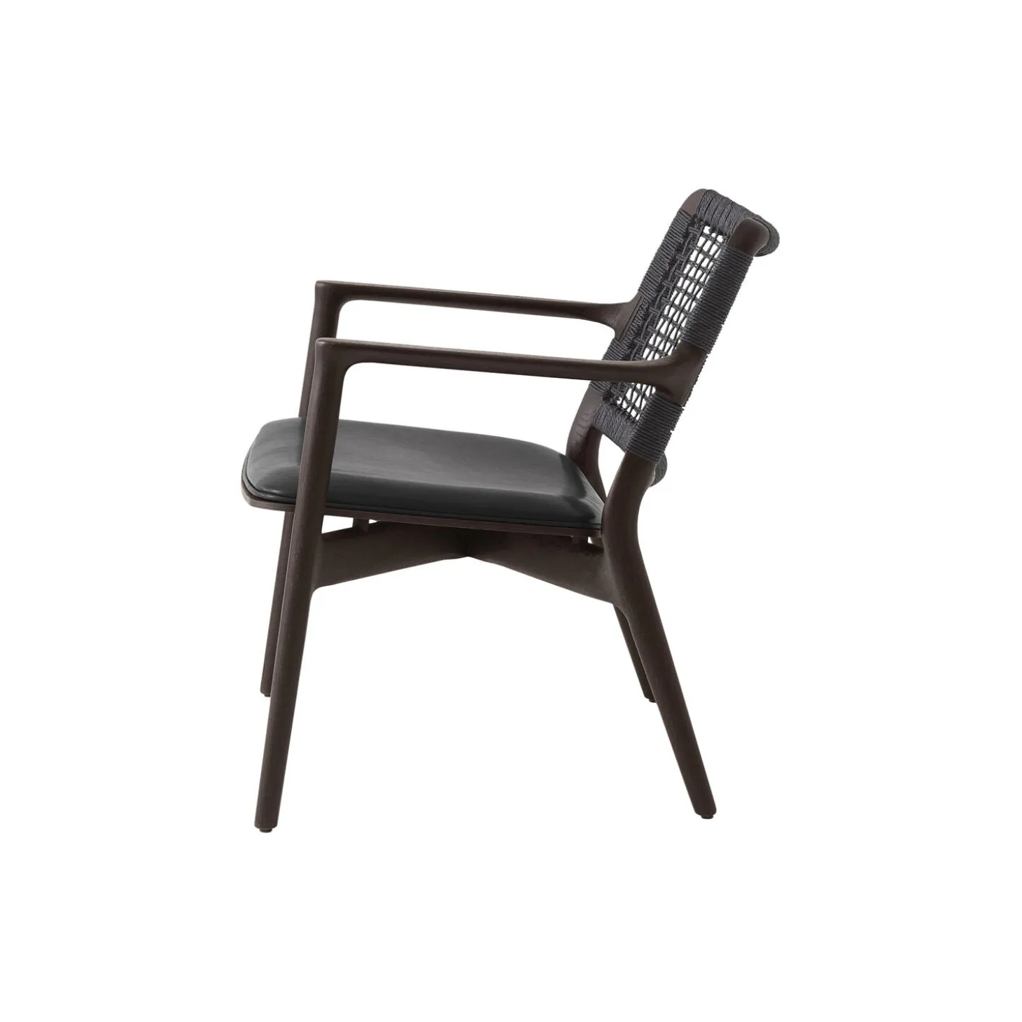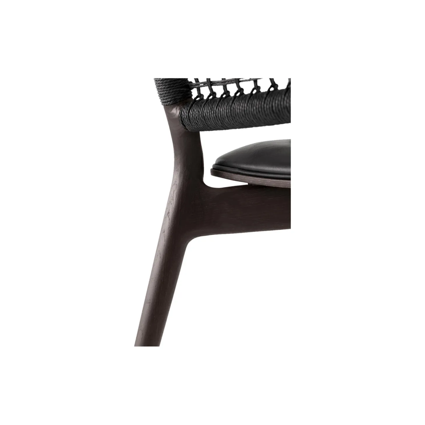 - Materiale: sædepolstring i læder, sæde i olieret mørkbejdset egetræsfinér, stel i olieret mørkbejdset eg og vævning af sort papirsnor